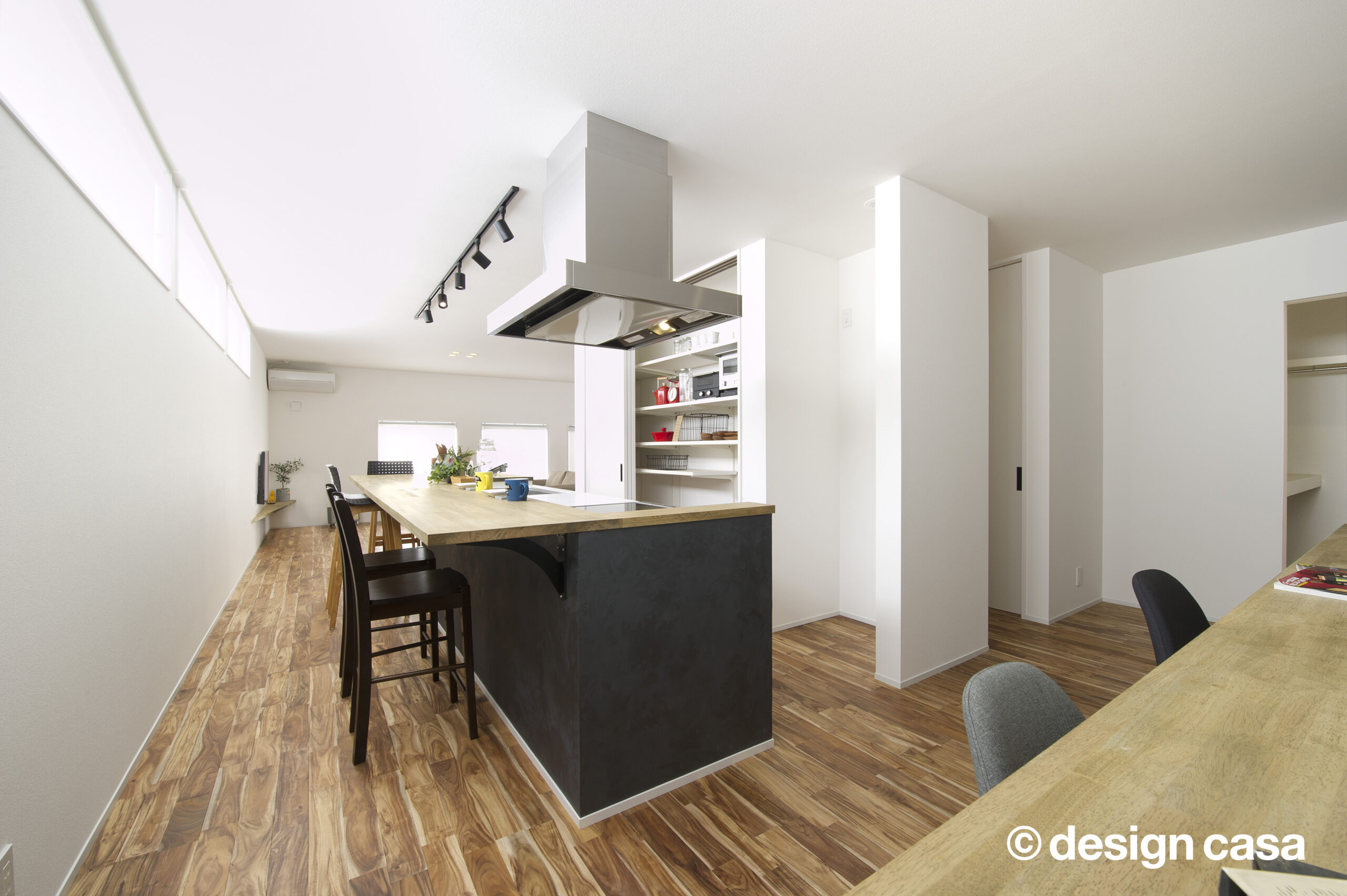 使い勝手とデザイン性を兼ね備えたキッチン。見せる収納で、道具もインテリアの一部に。