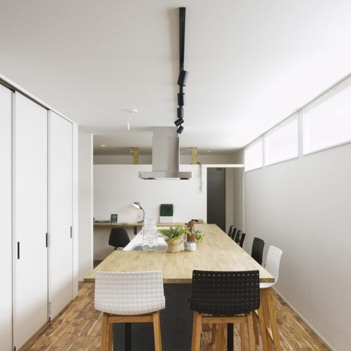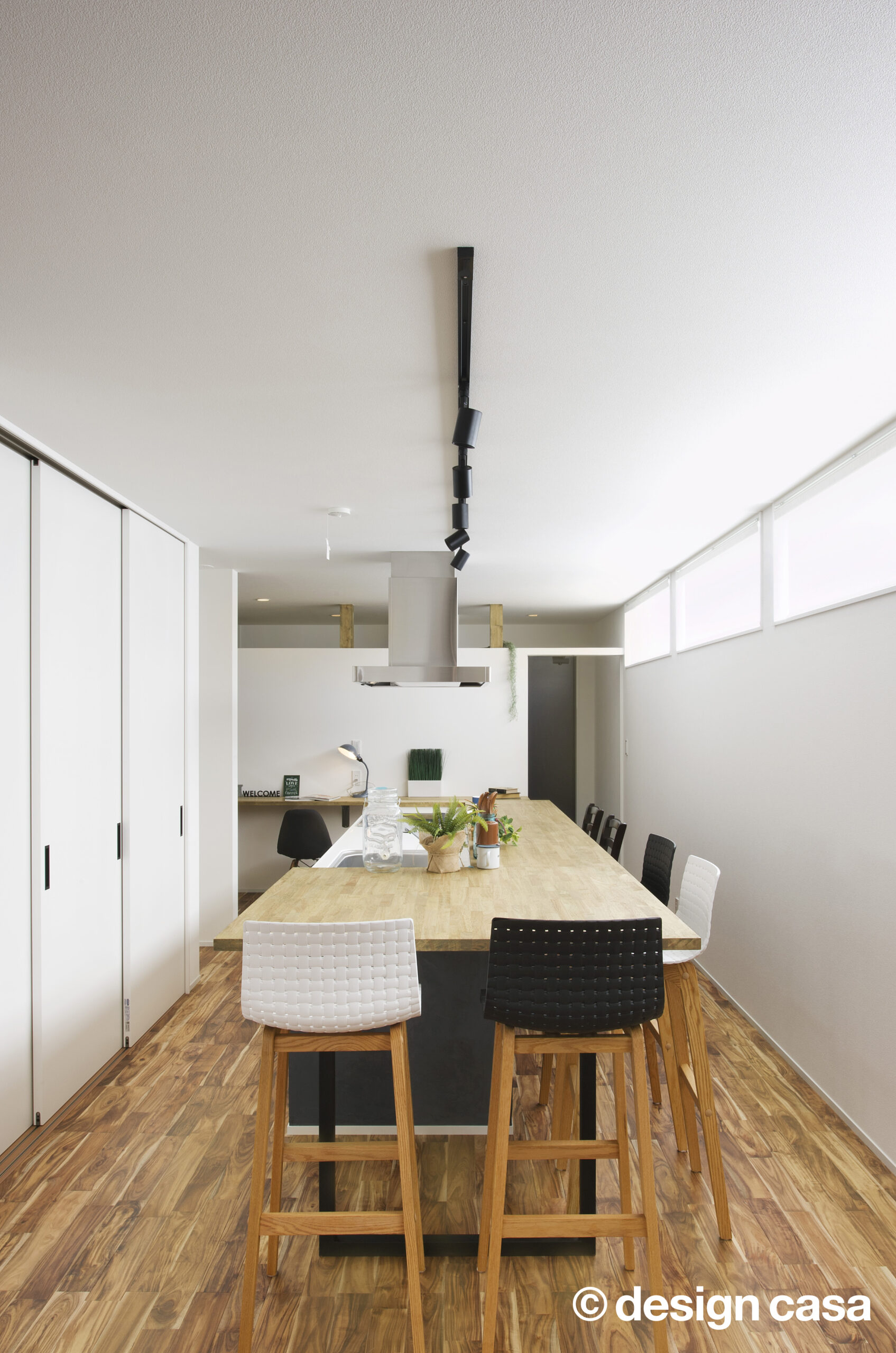 大きな作業台のようなテーブルを中心にしたダイニング。家族やゲストが自然と集まる心地よい場所です。
