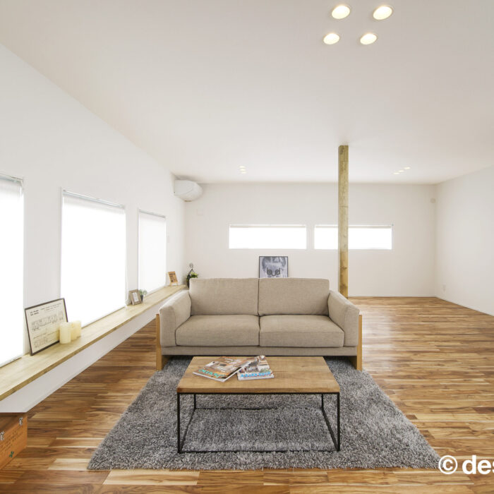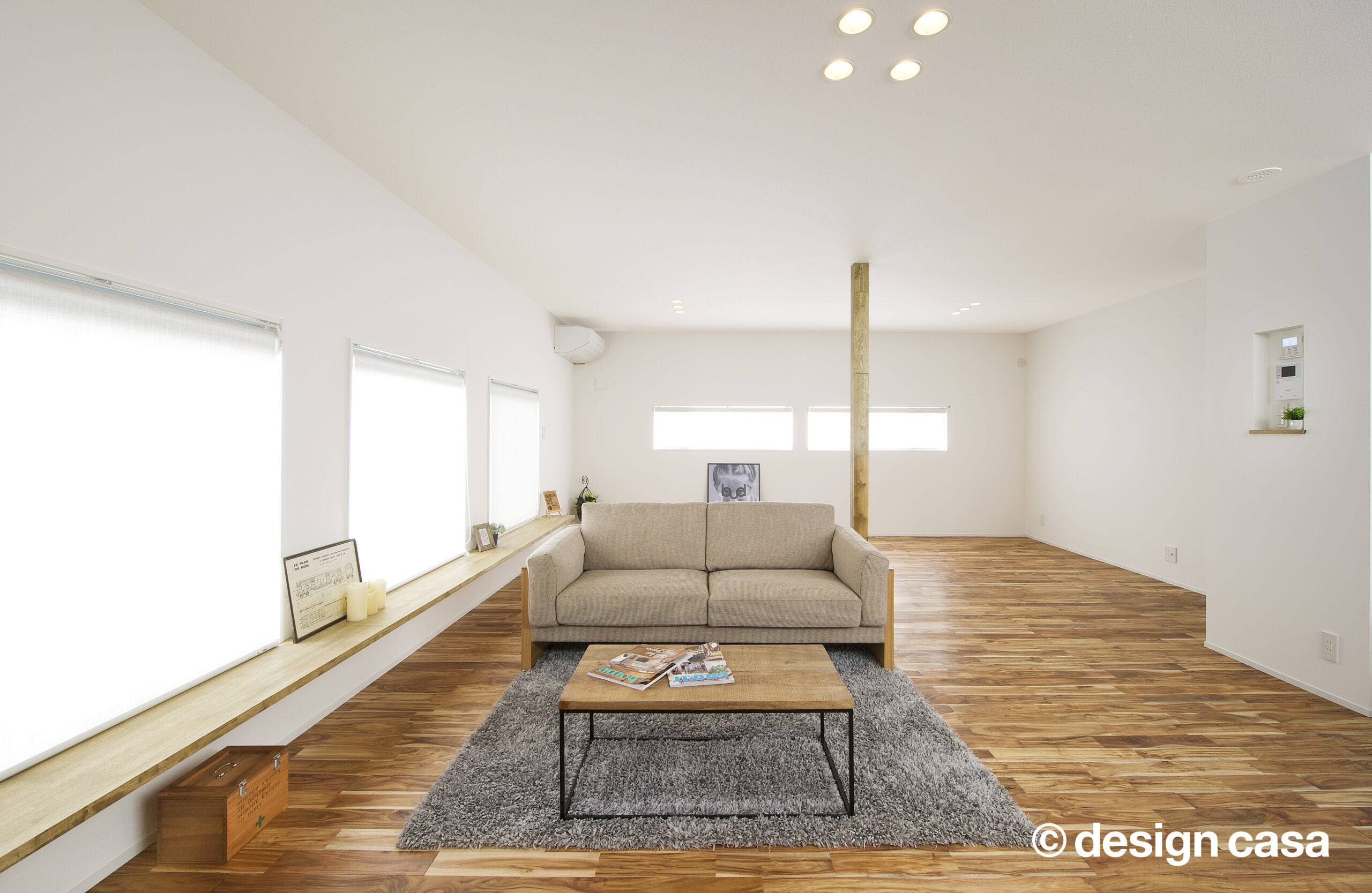 窓の高さと配置が絶妙で、外の気配を感じさせずに光を取り込むリビング。無垢の床が家族のくつろぎを優しく包みます。