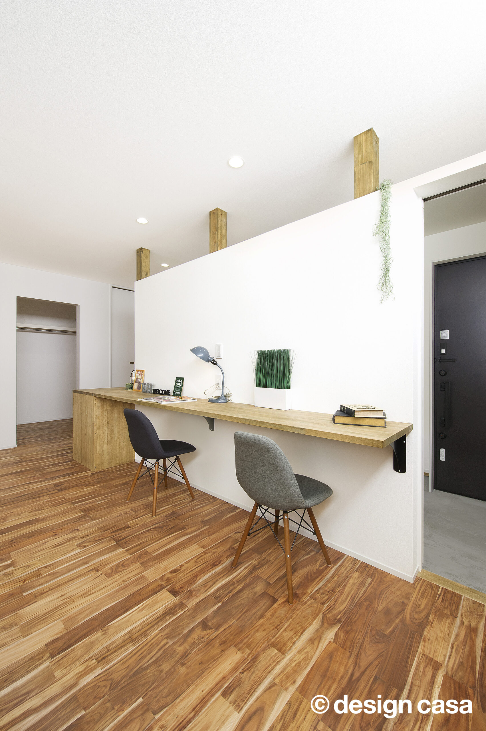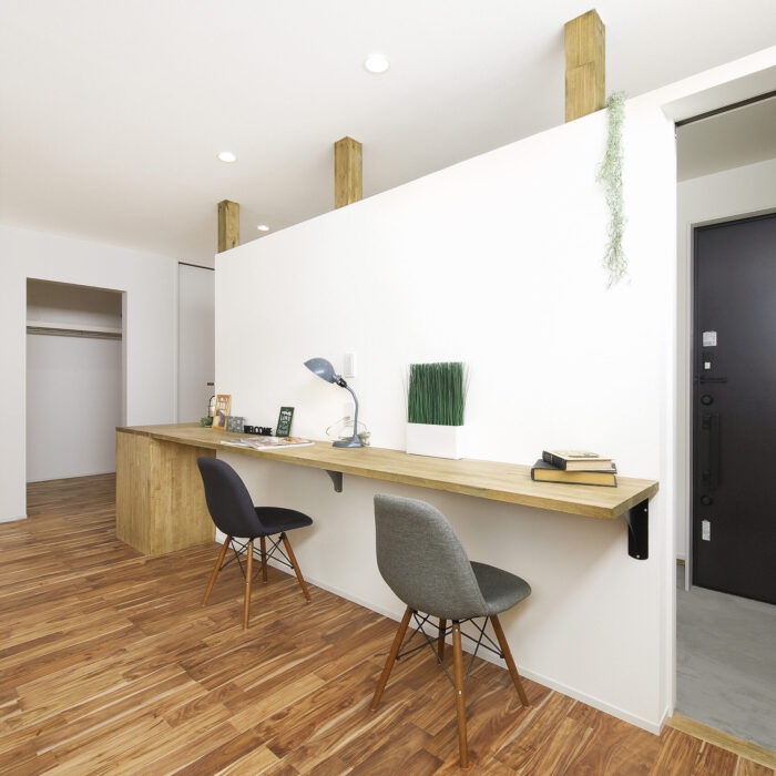 仕切り壁を活かしたコンパクトなワークスペース。家の中でも集中できる、ちょうどいい距離感です。