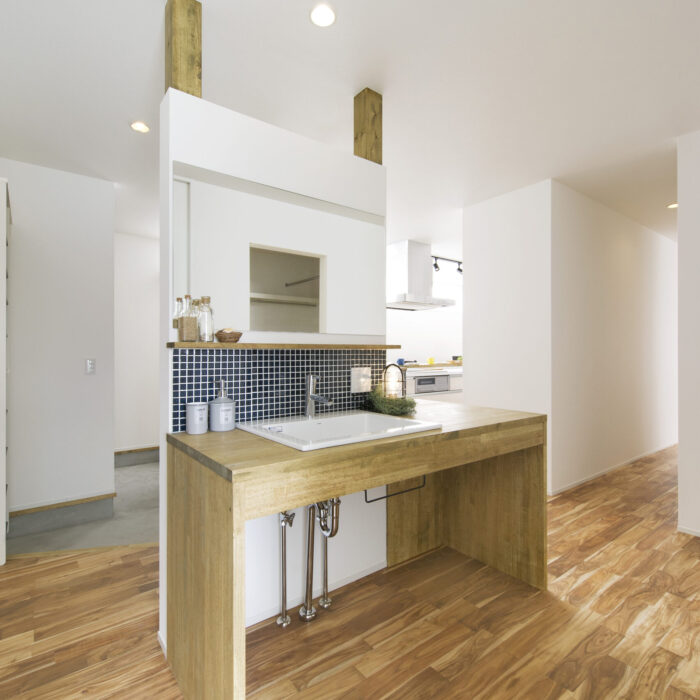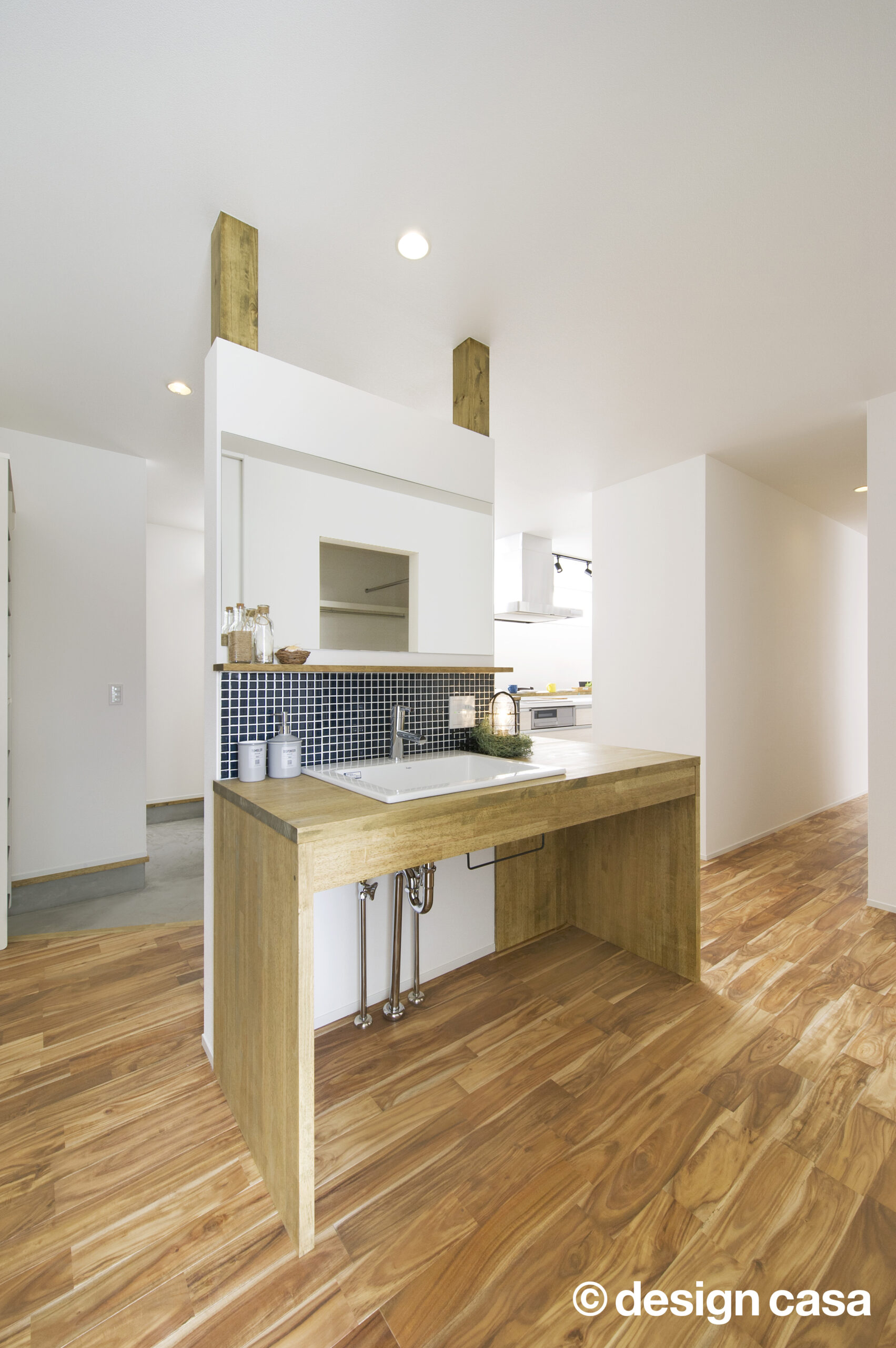 ナチュラルウッドとモザイクタイルが絶妙に調和した洗面台。空間の中に遊び心と落ち着きが共存しています。