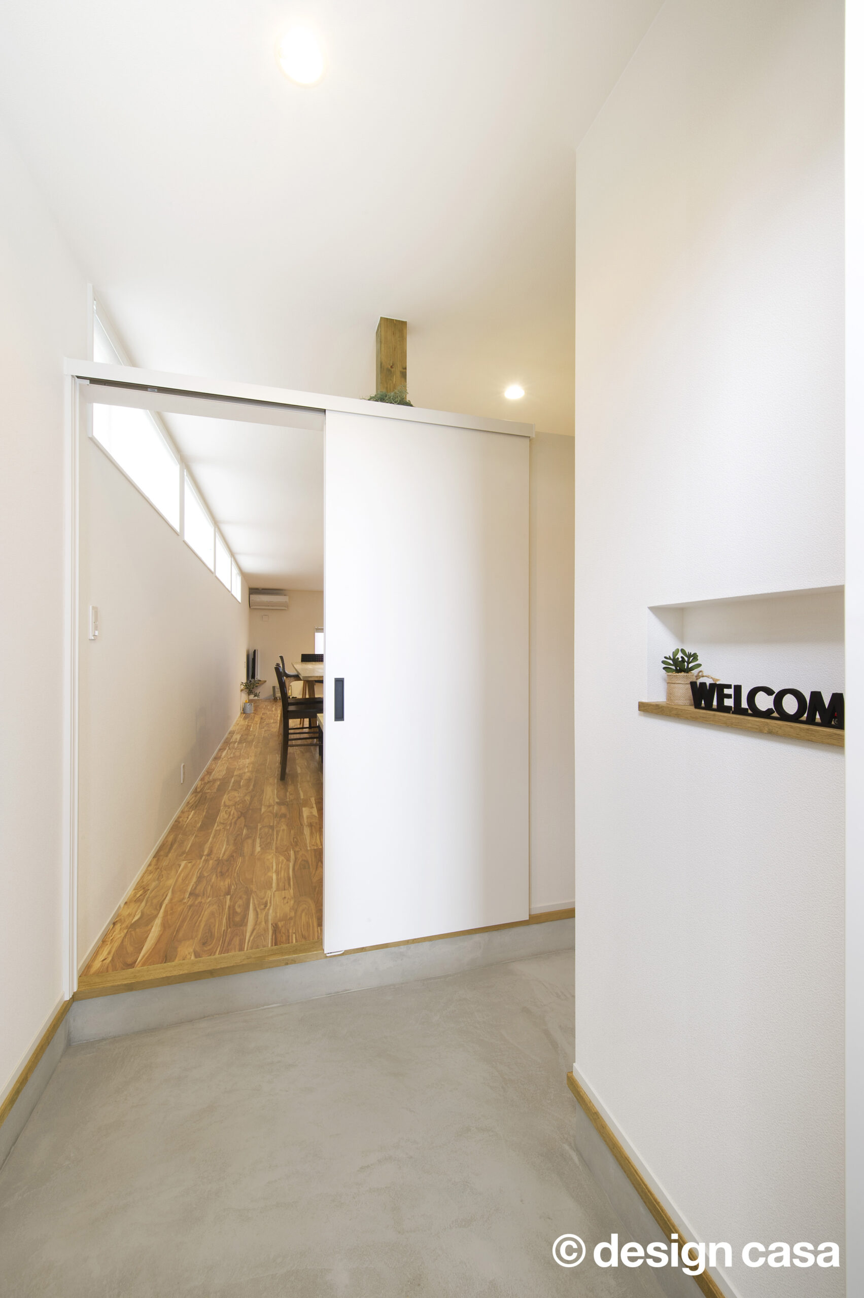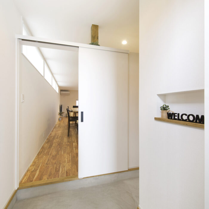 白を基調にしたシンプルで清潔感のある玄関。正面に広がるLDKへと自然につながるアプローチです。
