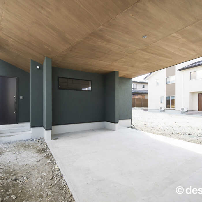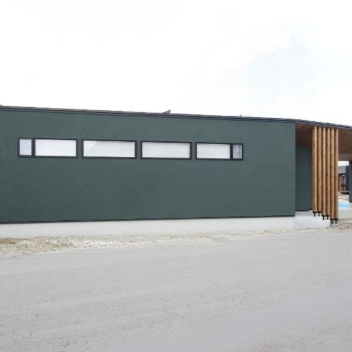深いグリーンの外壁が印象的なファサード。窓の配置を工夫し、外からの視線を遮る設計です。