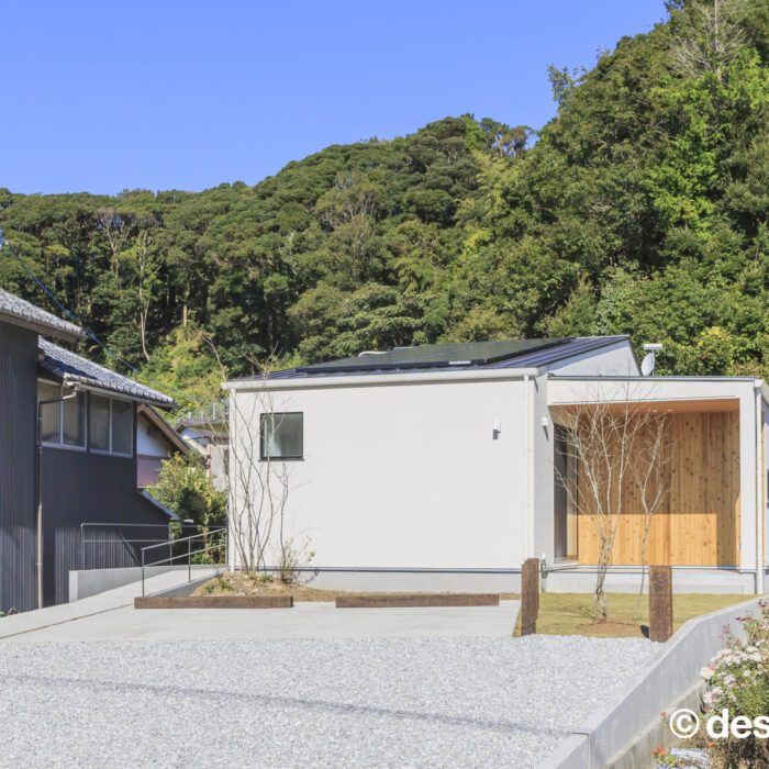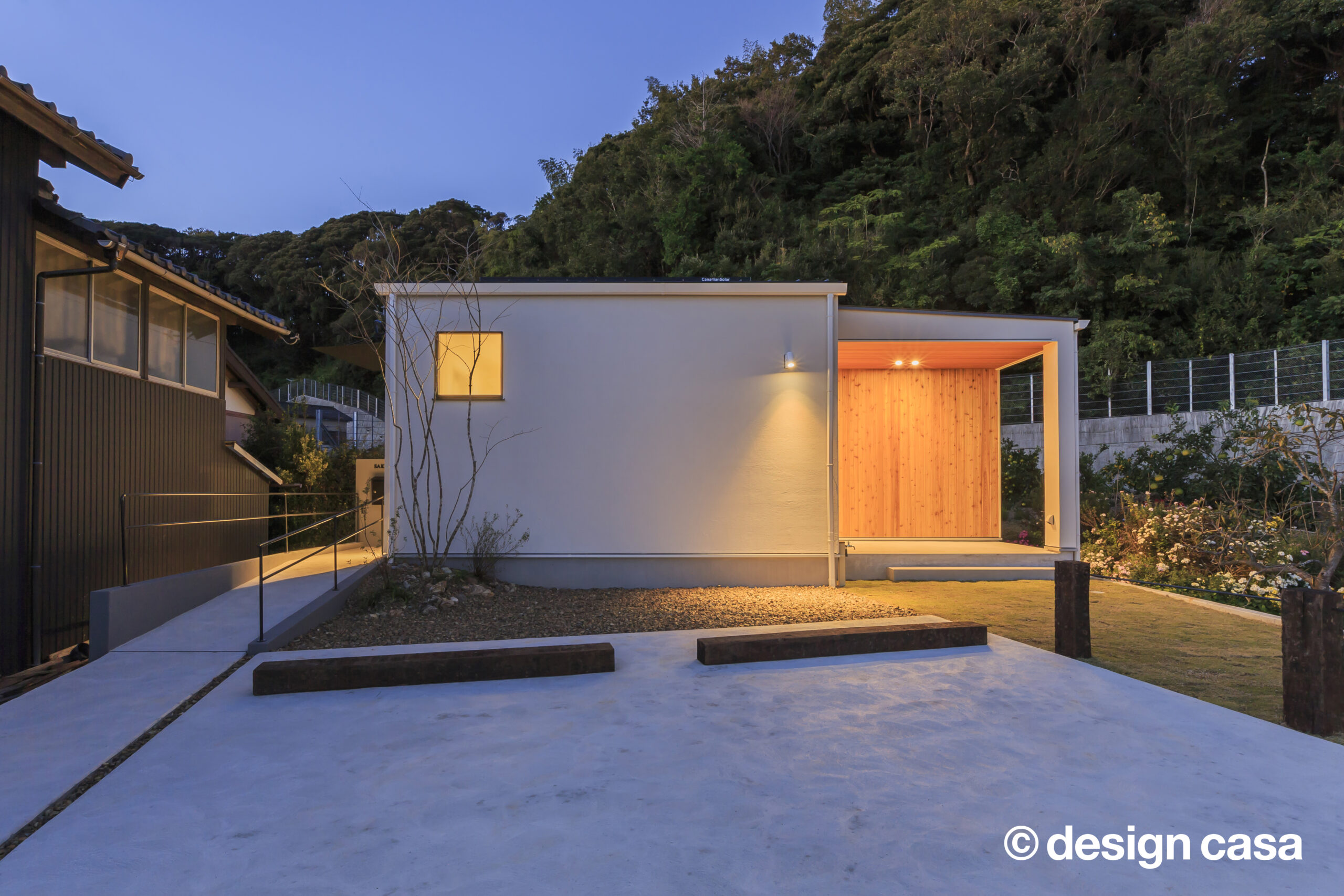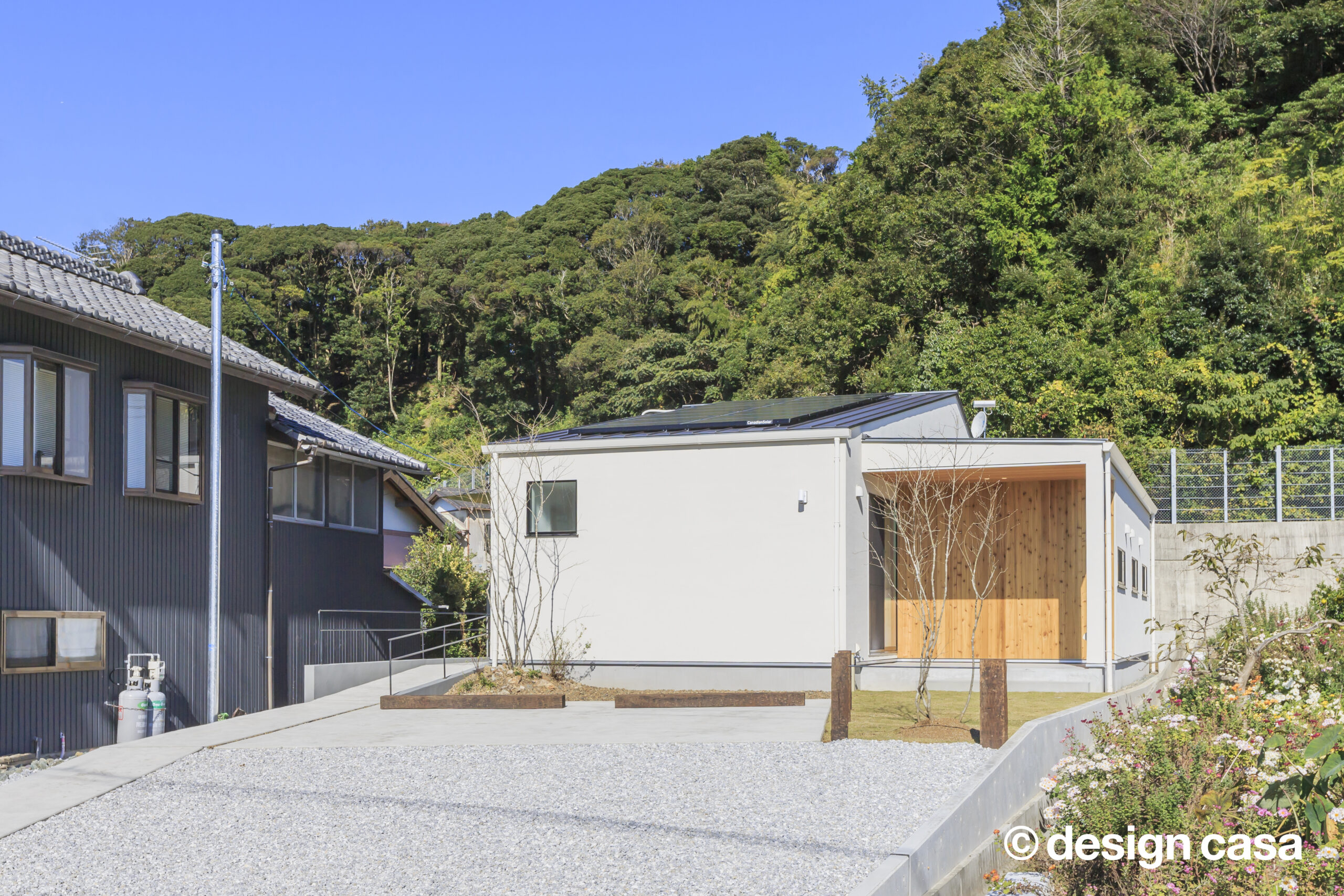 シンプルなフォルムに、木のぬくもりが映える印象的なエントランス。周囲の自然に溶け込むような落ち着いた佇まいです。
