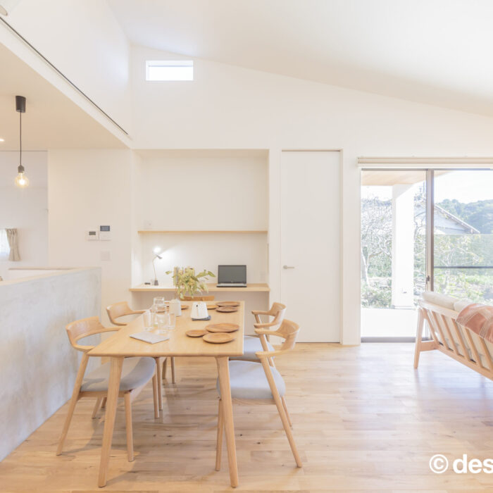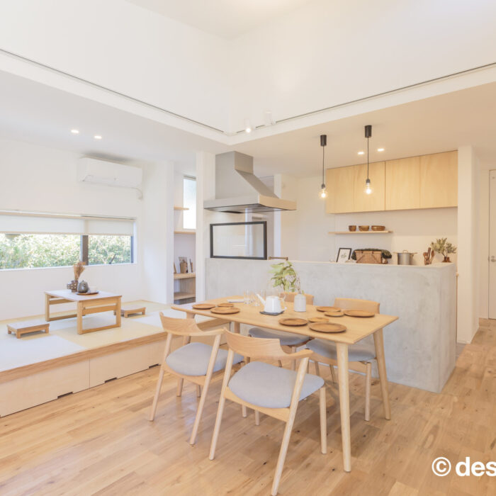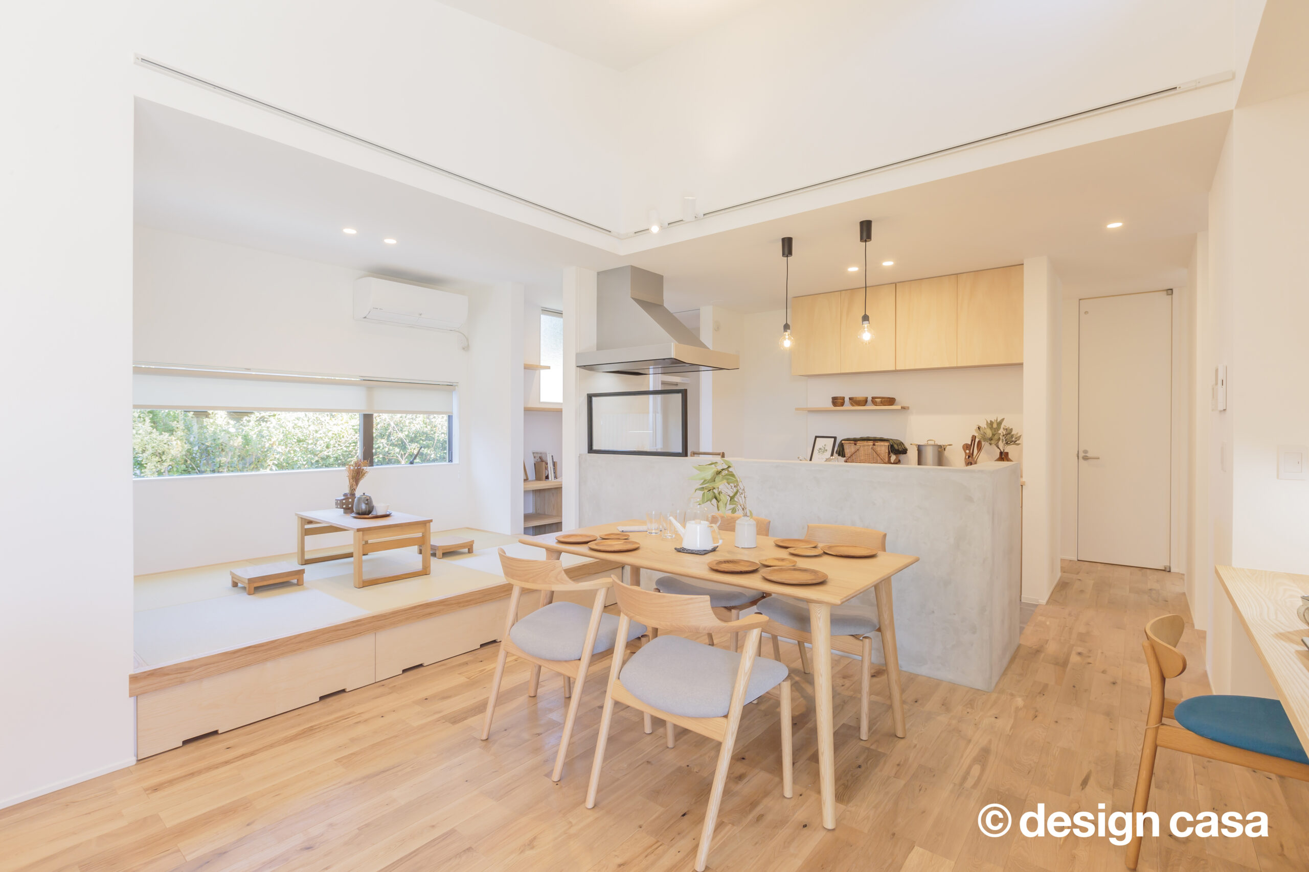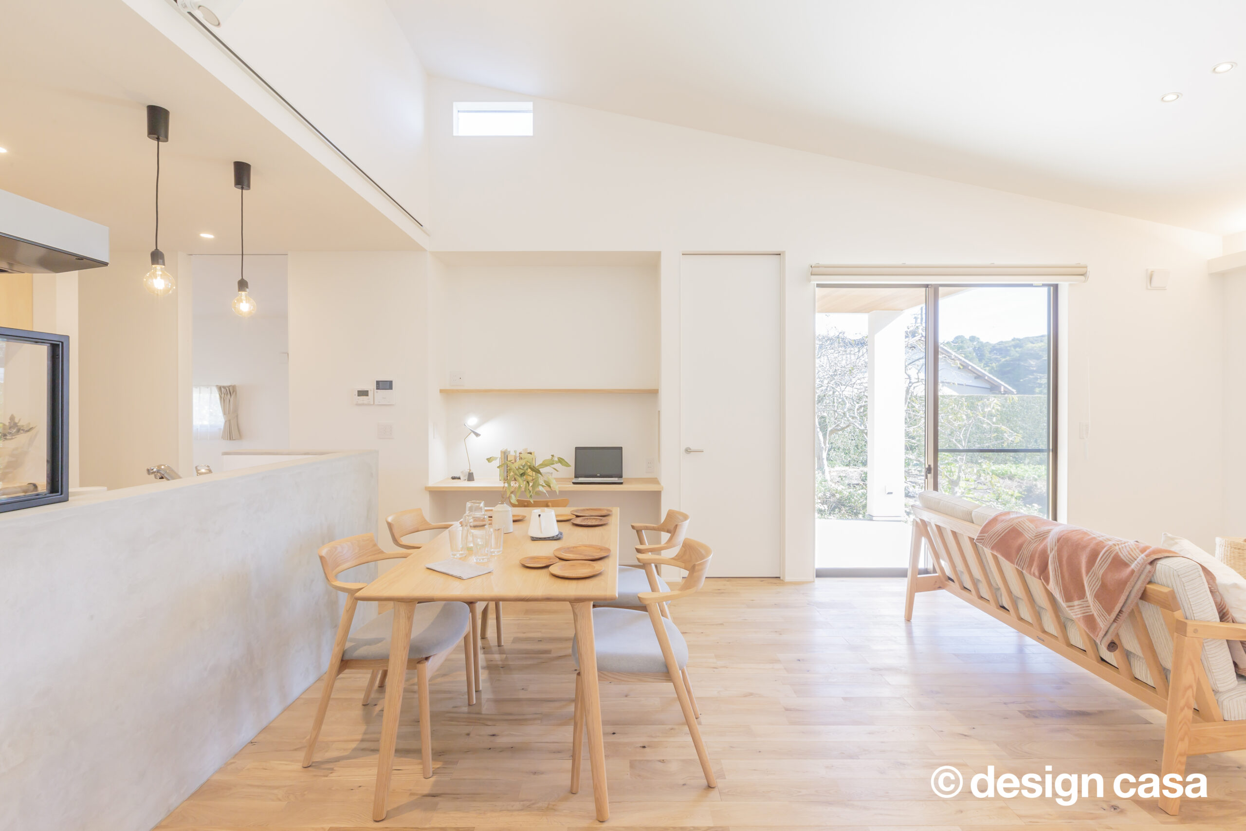 キッチンと一体化したダイニングは、生活の中心となる明るい場所。家事の合間も家族の様子を見守れる、安心感ある空間です。