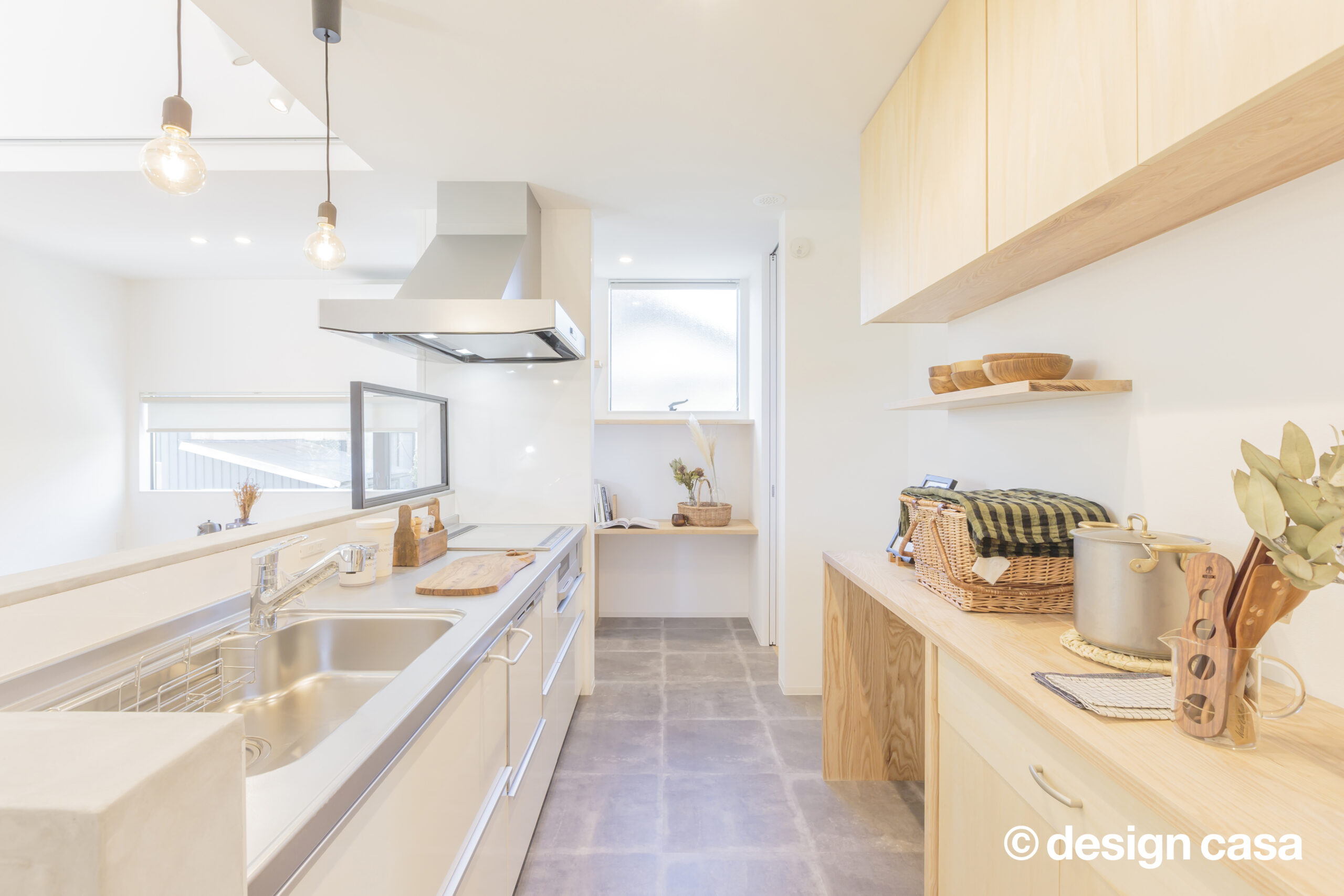 アイランド風のキッチンは回遊動線で家事効率も抜群。奥の家事スペースから水廻り・収納までがスムーズにつながります。