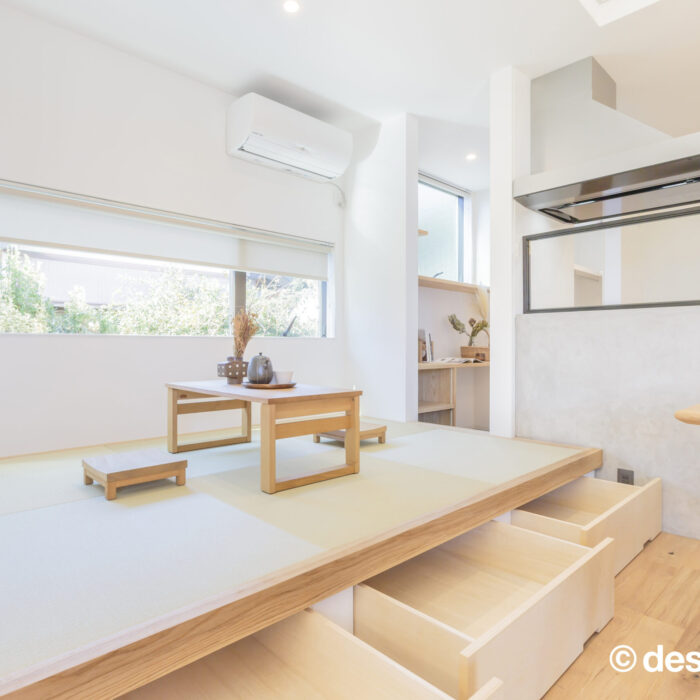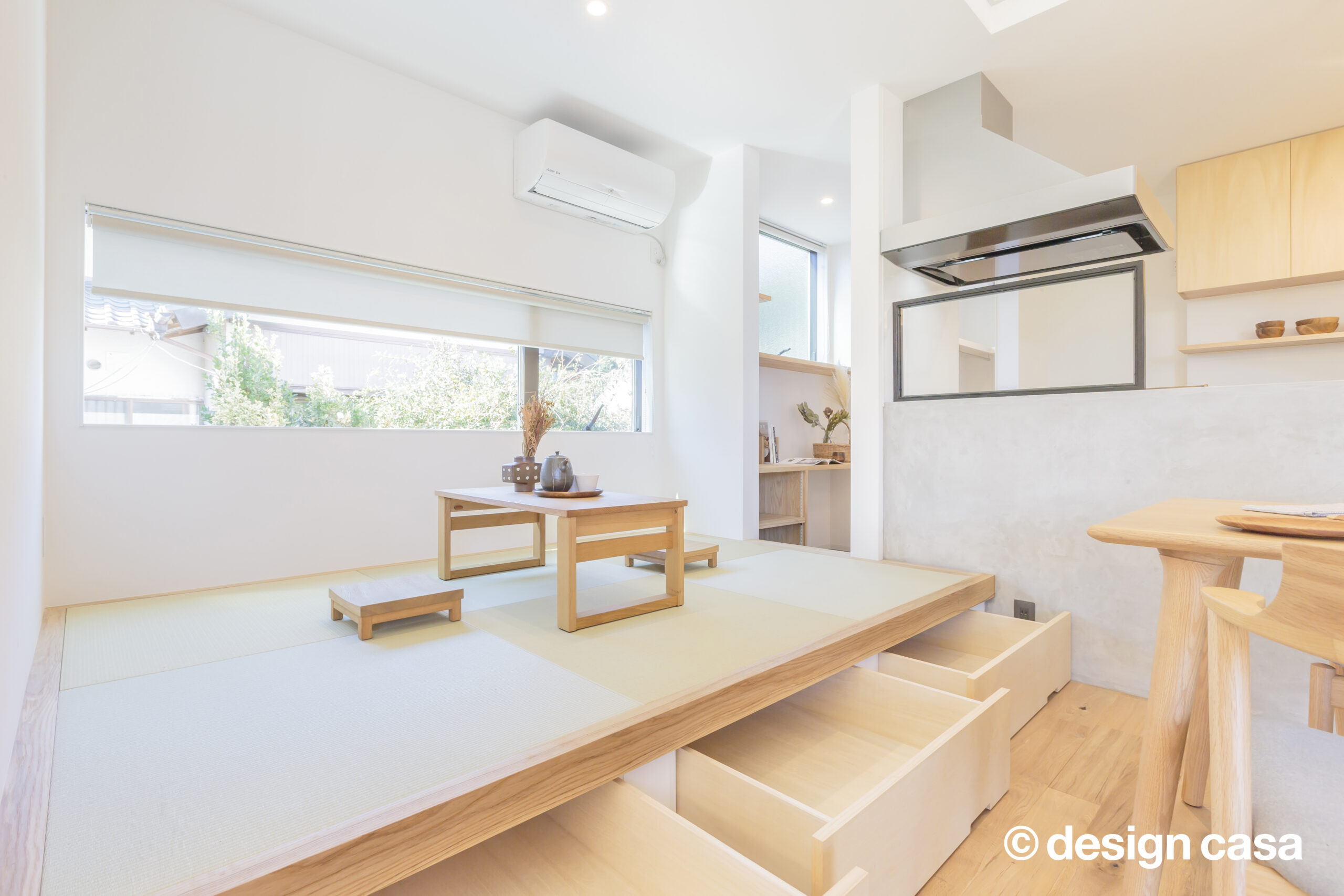 ちょっと一息つきたい時にぴったりの畳スペース。引き出し収納付きの小上がりで、空間を無駄なく活用しています。