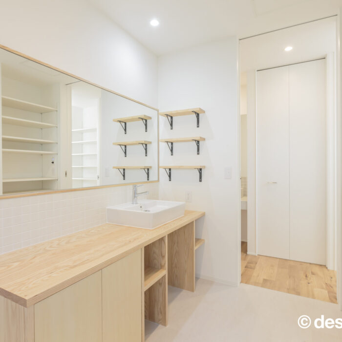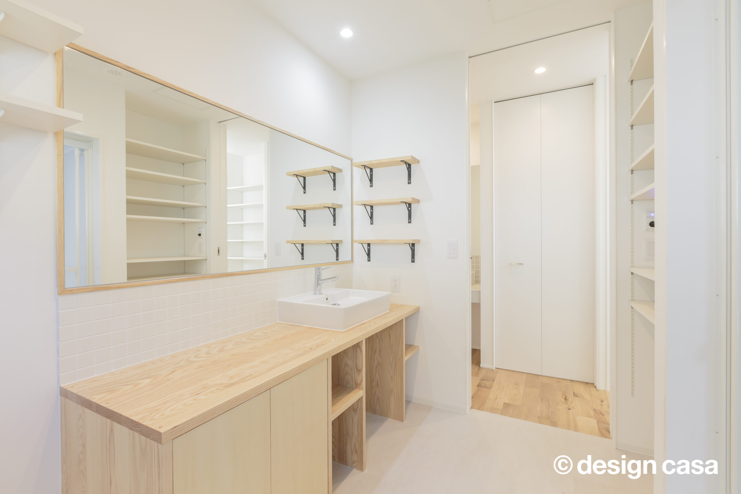 洗面・脱衣・ランドリーが一体となった効率的な設計。勝手口やファミリークローゼットともつながり、家事動線を最短に。