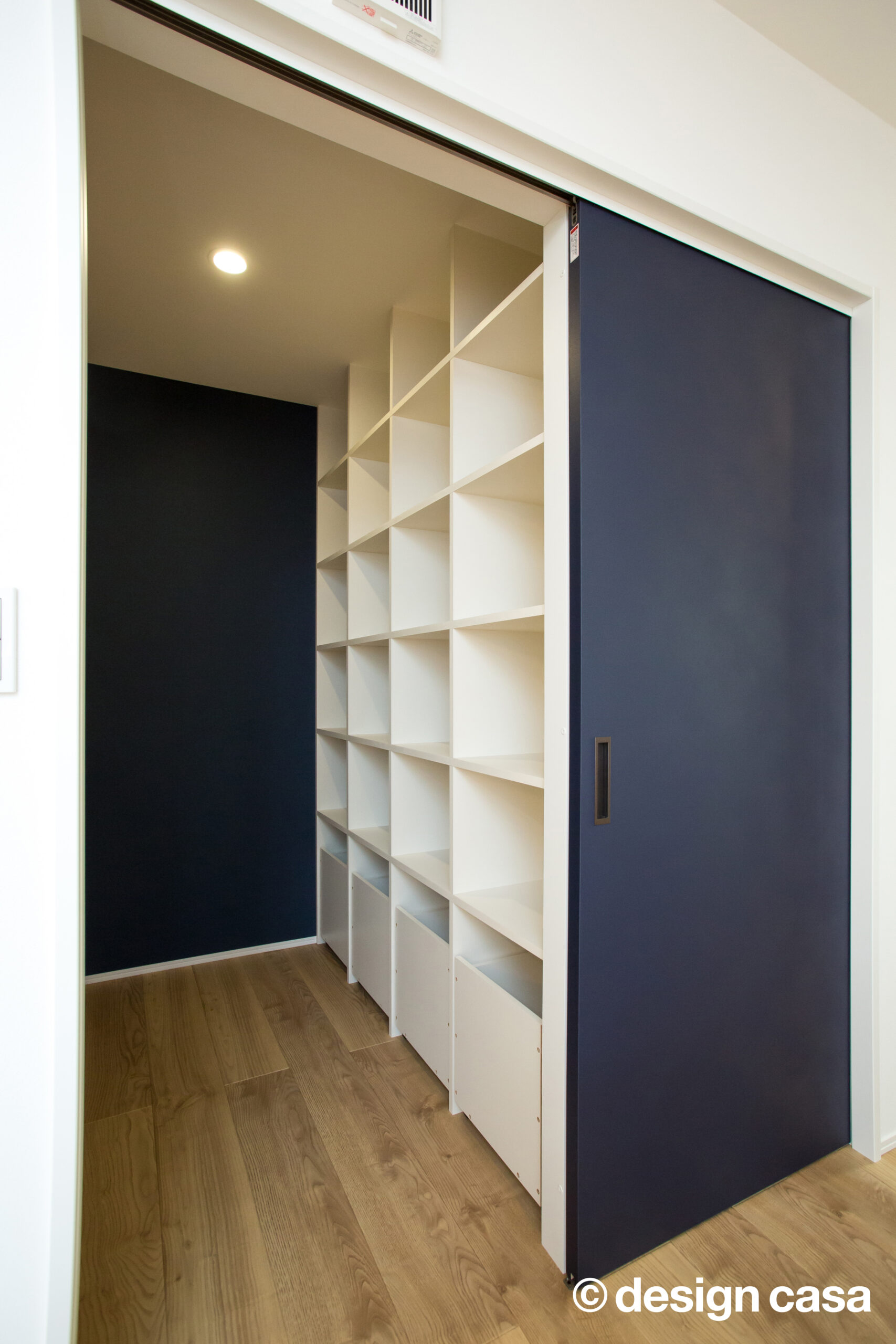 ブルーの引き戸がアクセントとなり、空間を引き締めています。