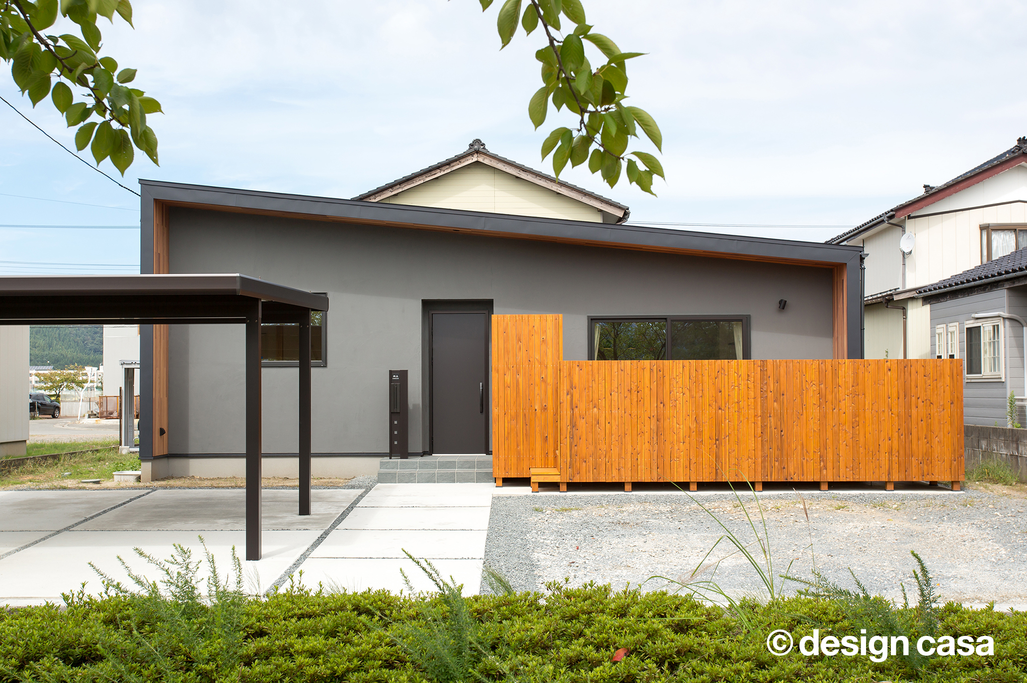 レッドシダーの温もりとブルーグレーの塗り壁が印象的な、落ち着きのある佇まい。