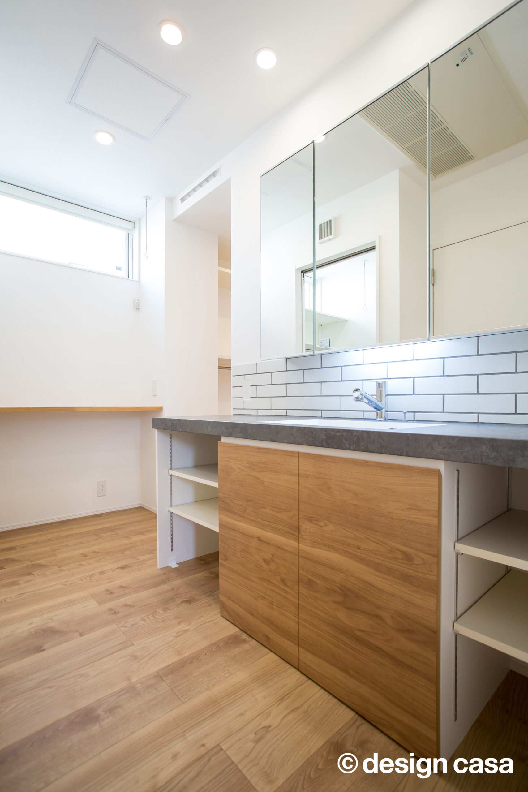白を基調に、タイルと木の素材感が映える爽やかな洗面空間。