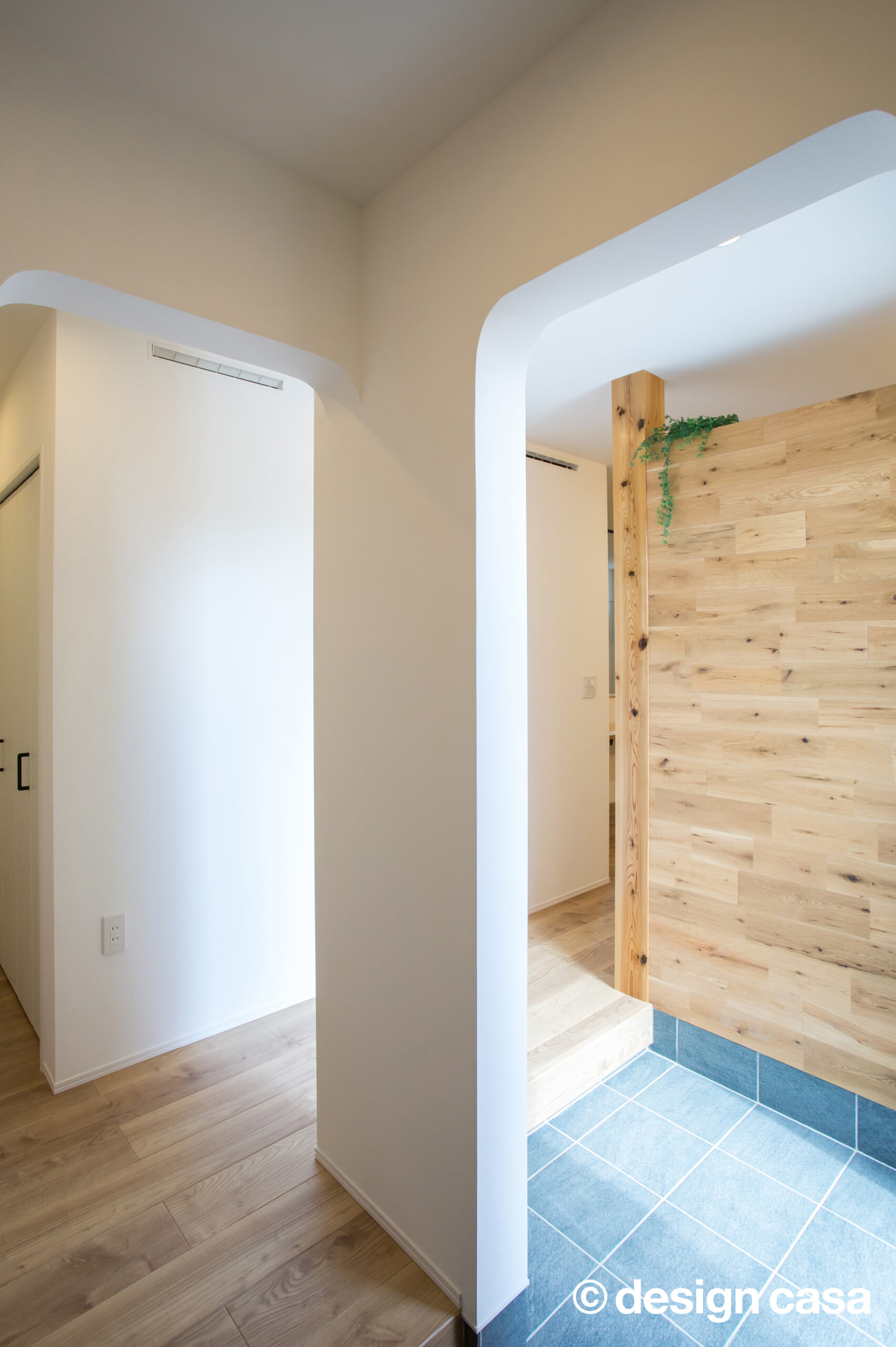 曲線を描く開口がやさしい印象を与える、ナチュラルなエントランス。