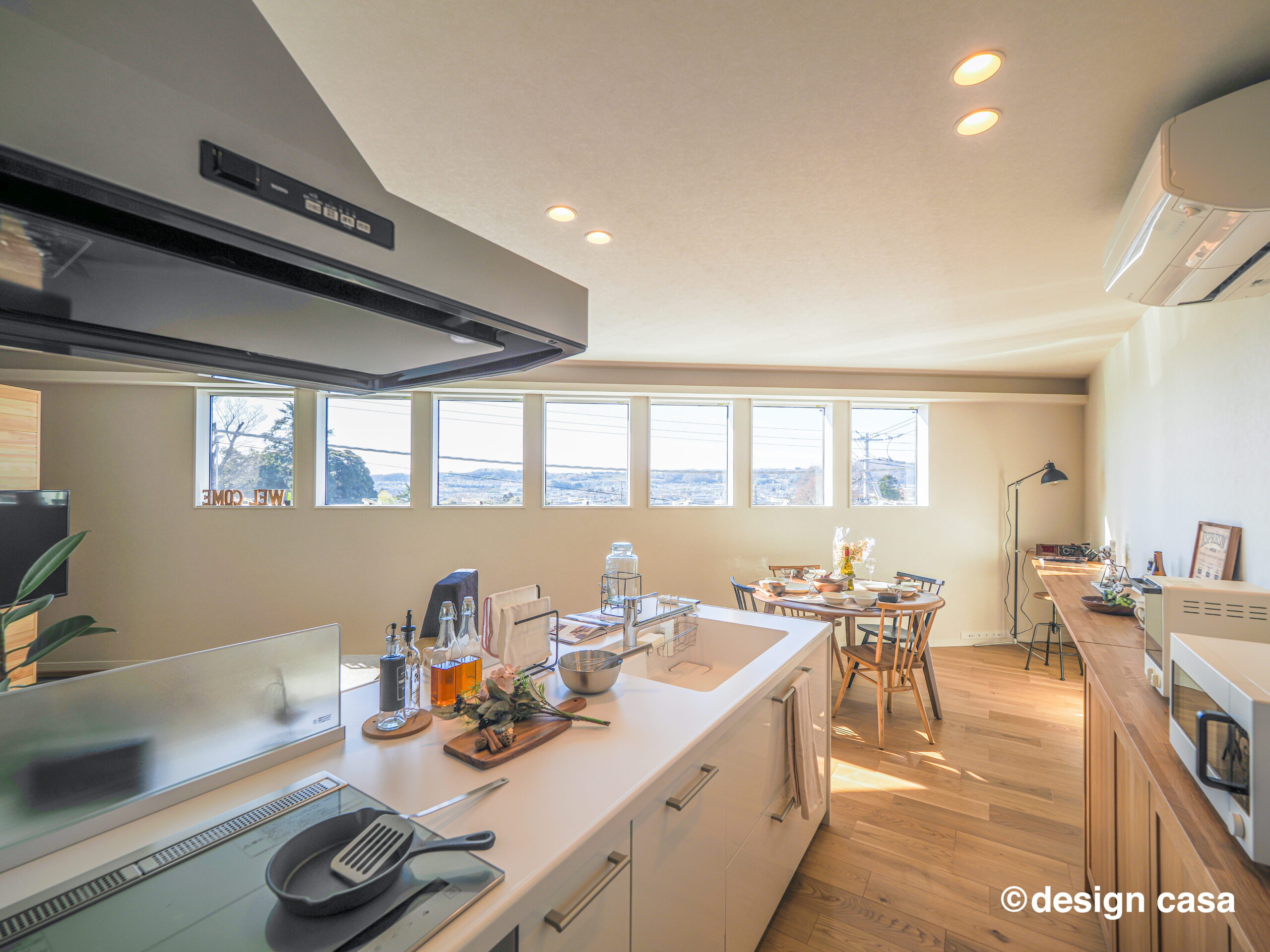 白を基調としたキッチンが、空間の中心に伸びやかに構えます。