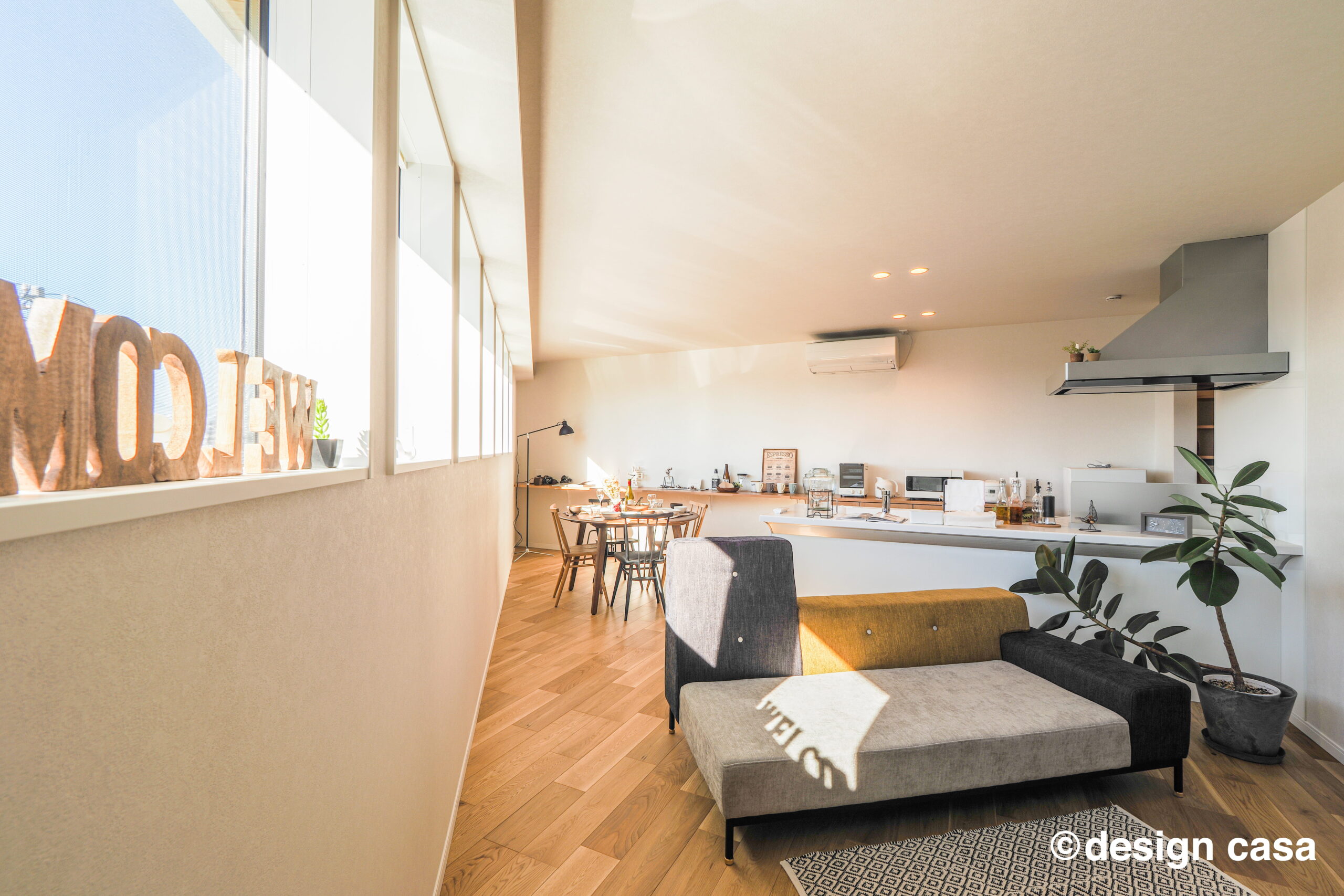 並ぶ窓からやわらかな光が差し込み、食卓を包み込みます。