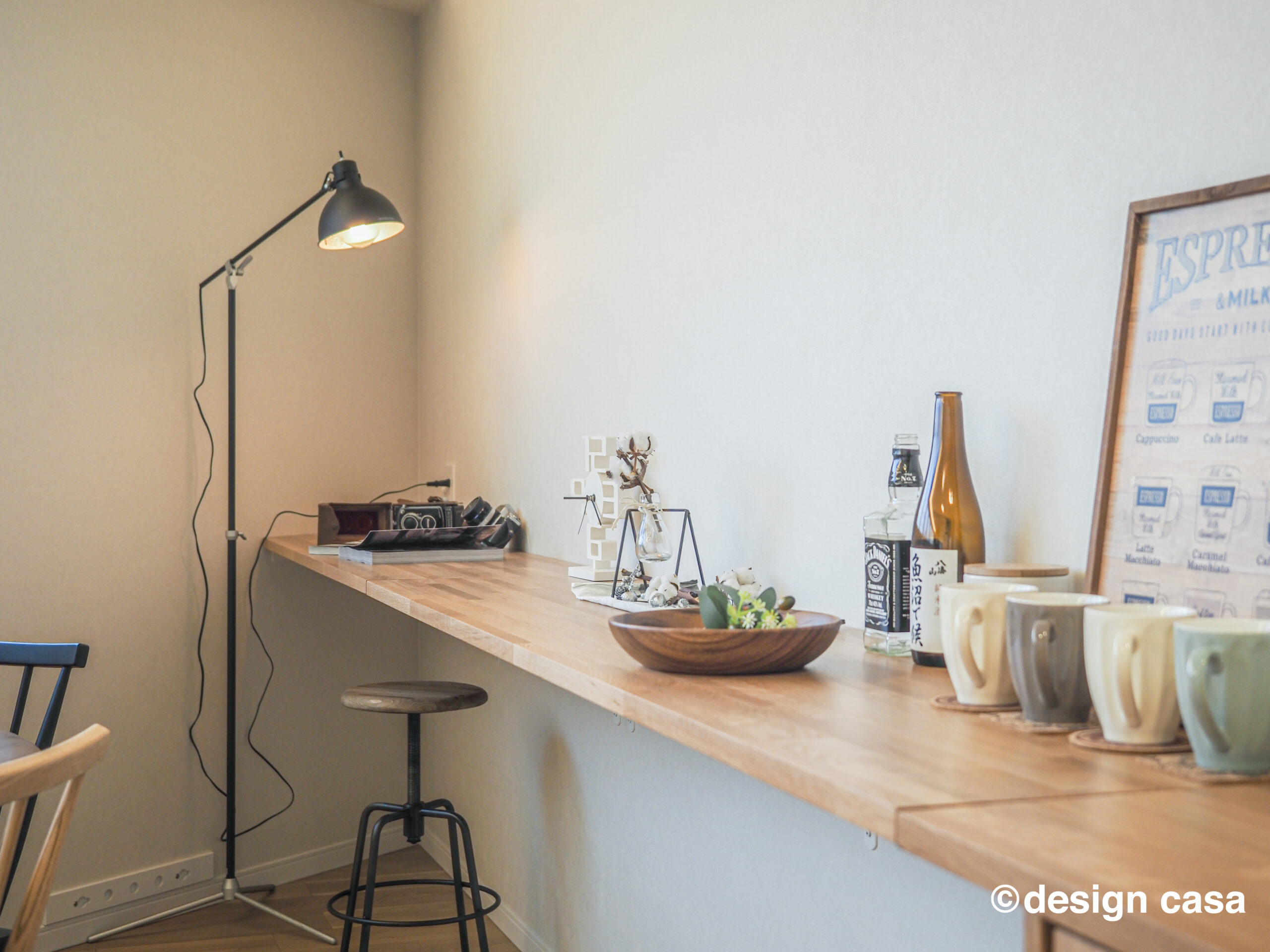 壁面に設けたカウンターが、暮らしの中に静かな集中の場をつくります。
