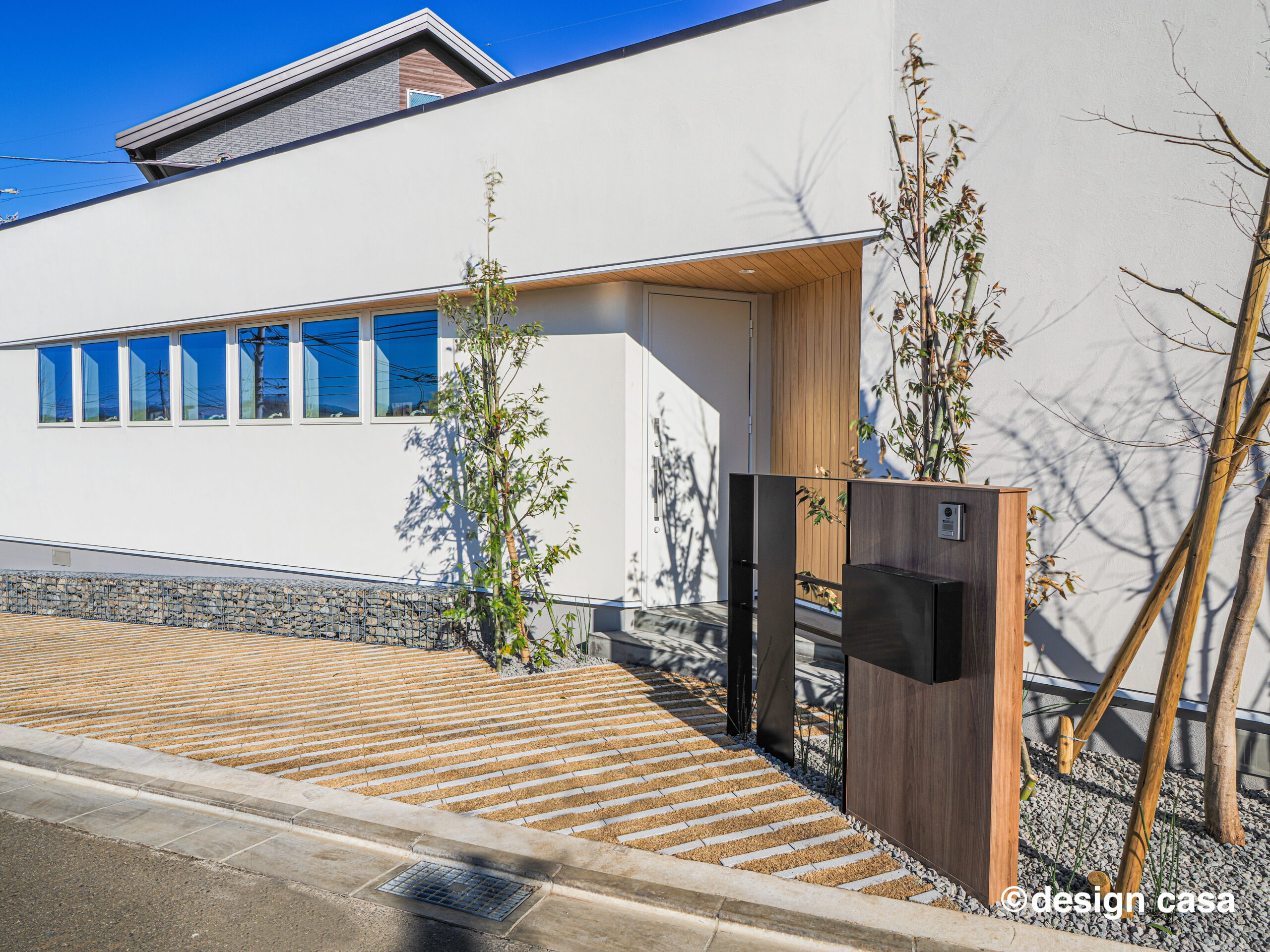 水平に伸びるフォルムが、敷地の輪郭と静かに呼応する外観。