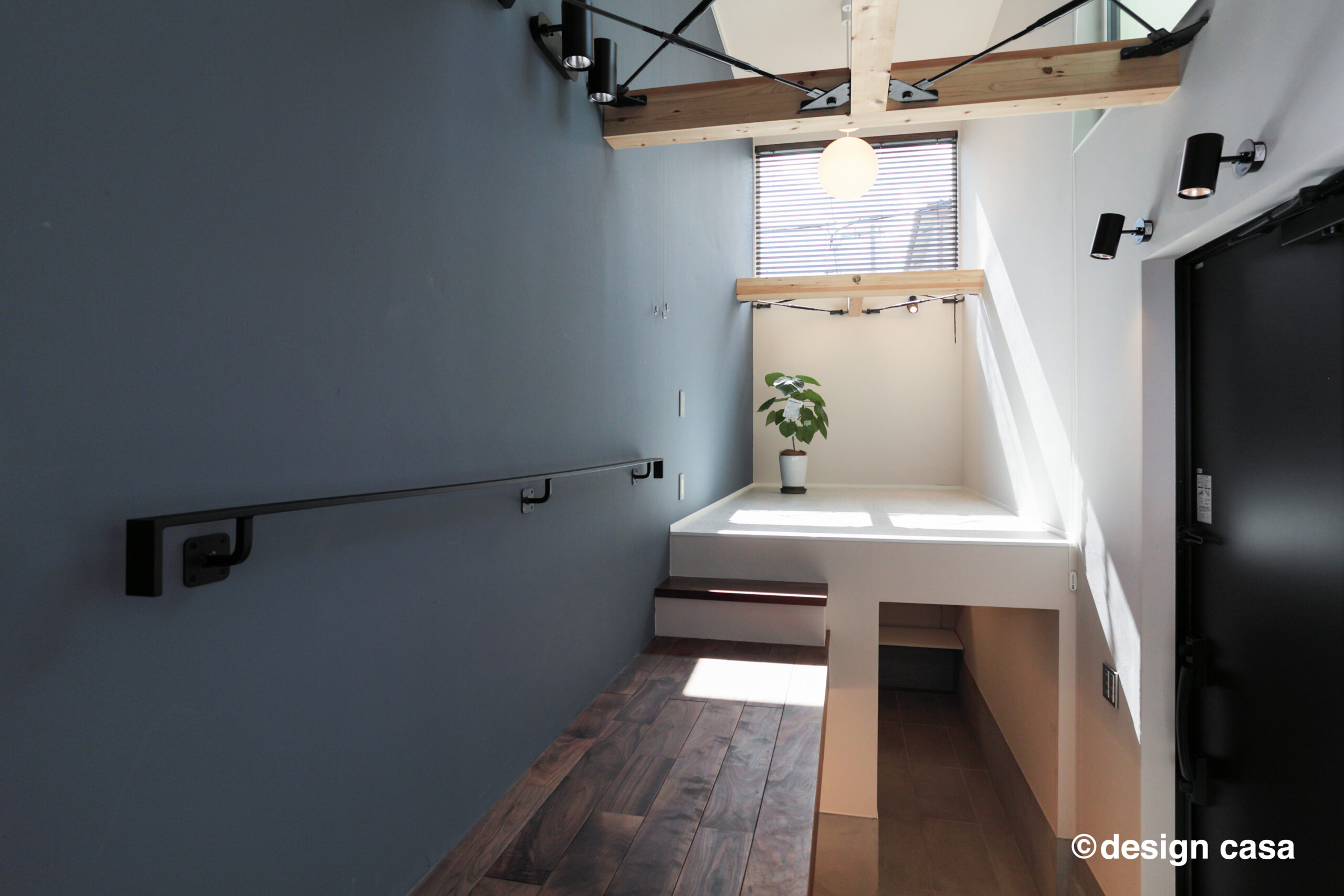 光をたどるように上がる階段の途中に、ピアノを据えた象徴的な空間。