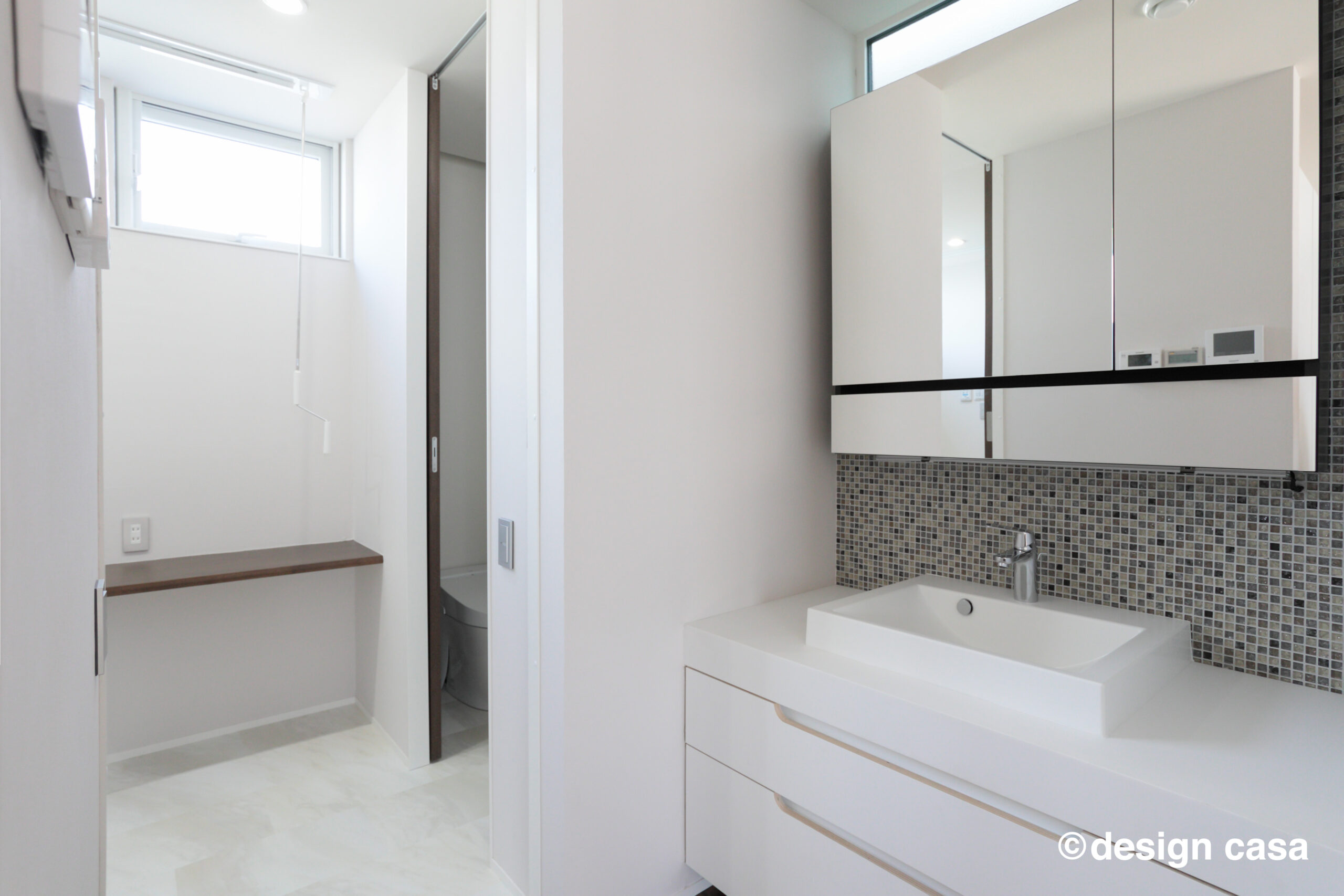 モザイクタイルがさりげない個性を添える、清潔感のある洗面空間。