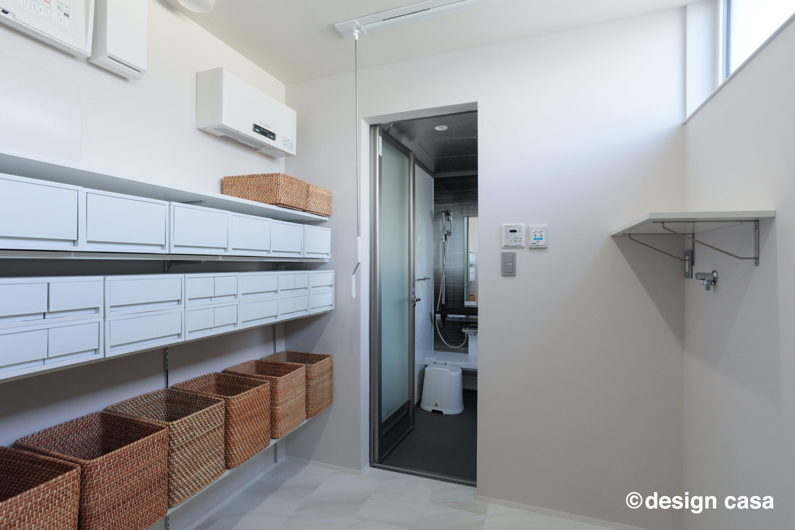 収納棚と作業スペースを備えた、実用性の高い脱衣室。