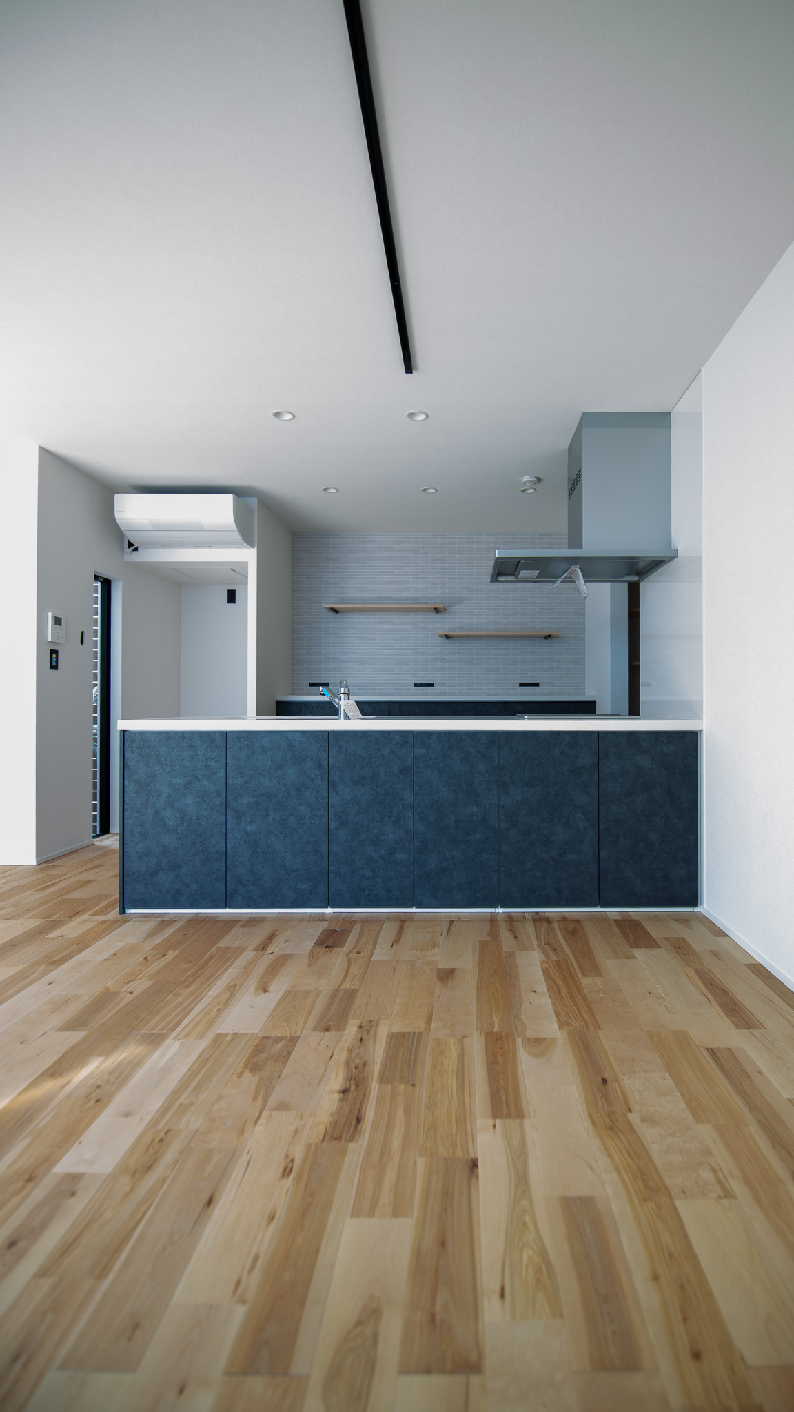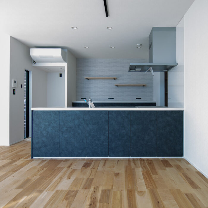 ネイビーの面材が上品に映えるアイランドキッチンは、空間の主役にぴったりの存在感。