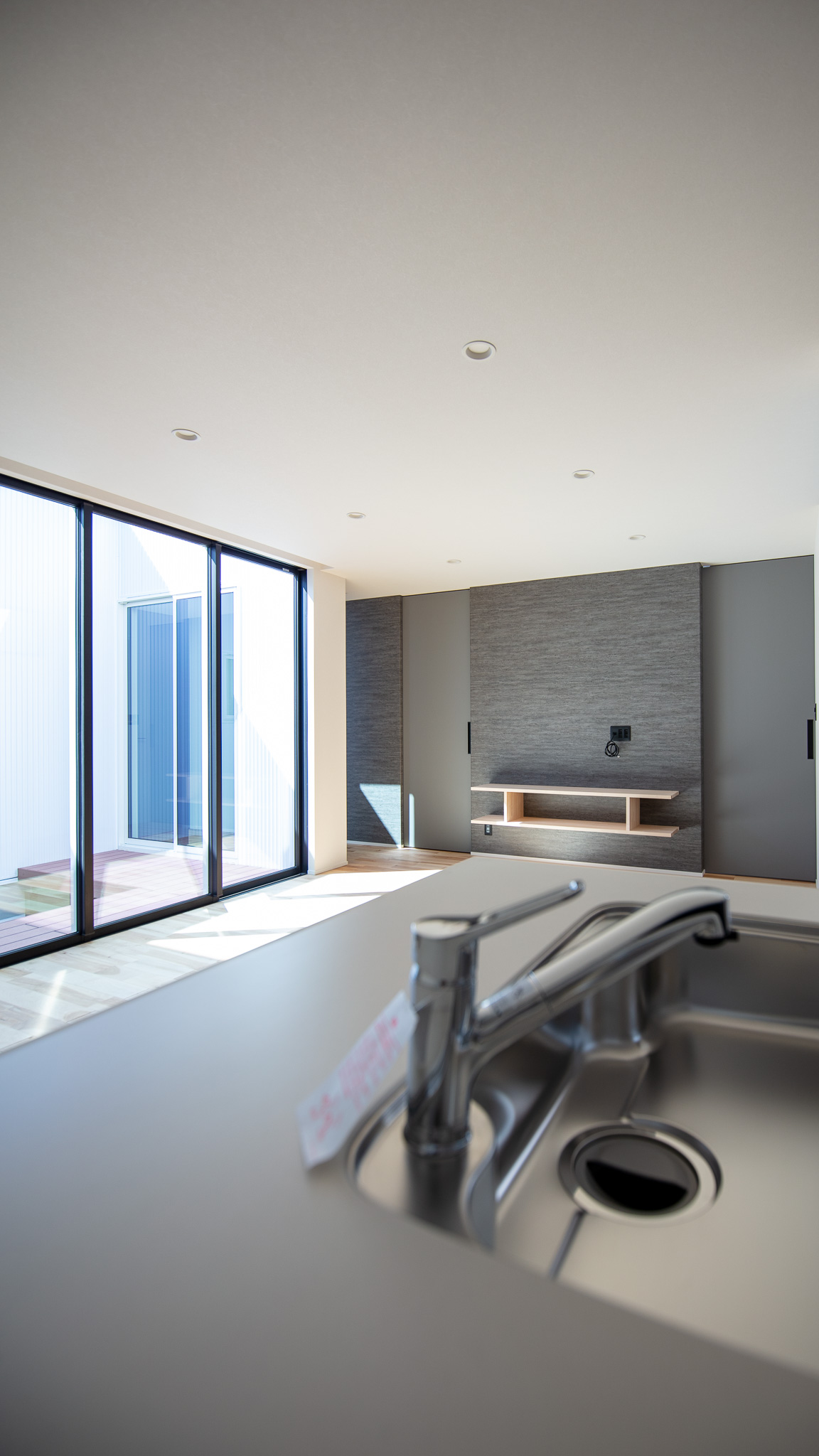 キッチンに立つと、視線の先には中庭の空が広がる気持ちのいい眺め。