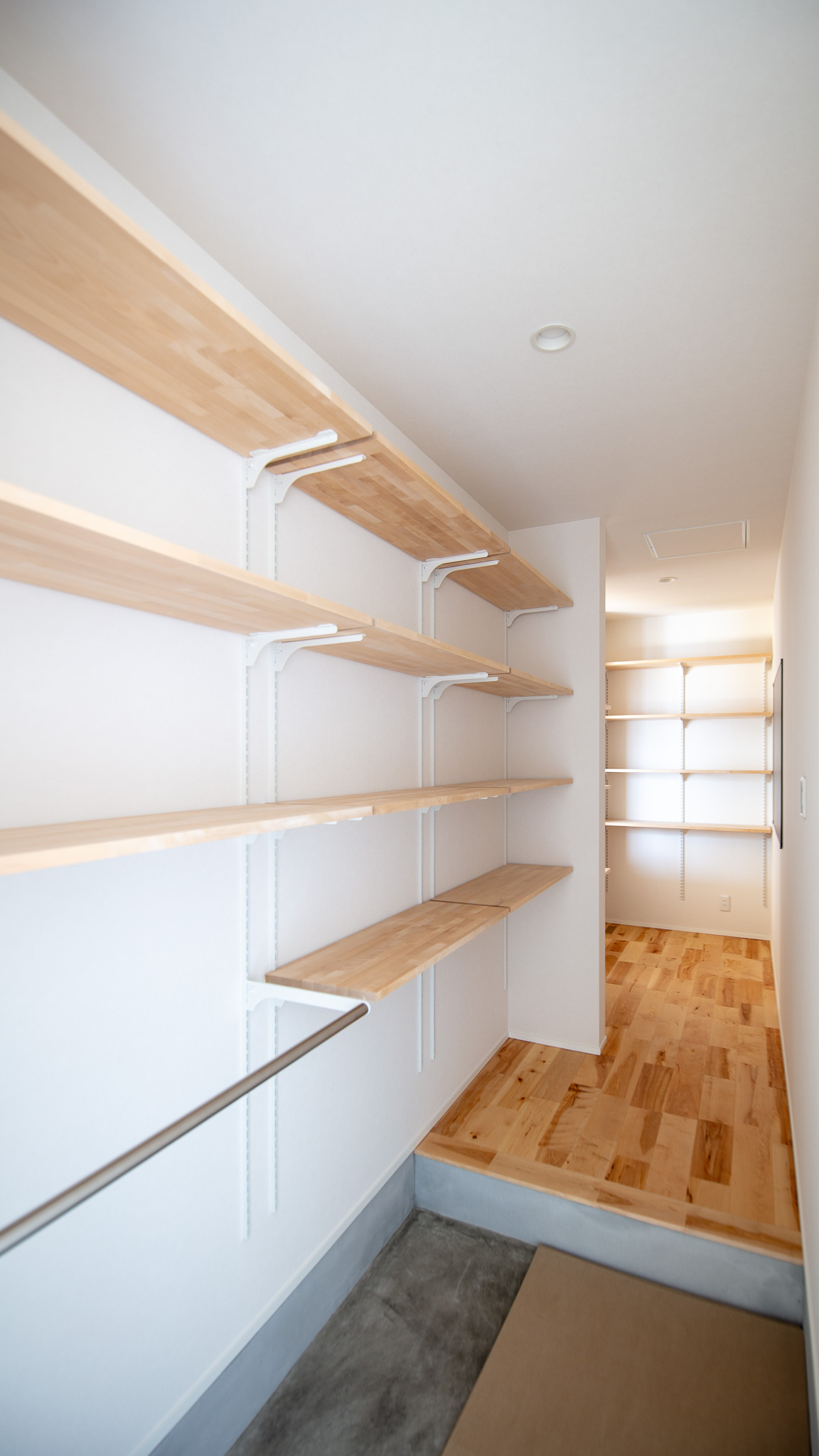 玄関横には、靴もアウトドア用品もベビーカーもまとめて収納できる大容量のシューズクローク。