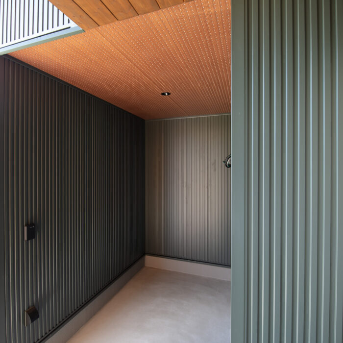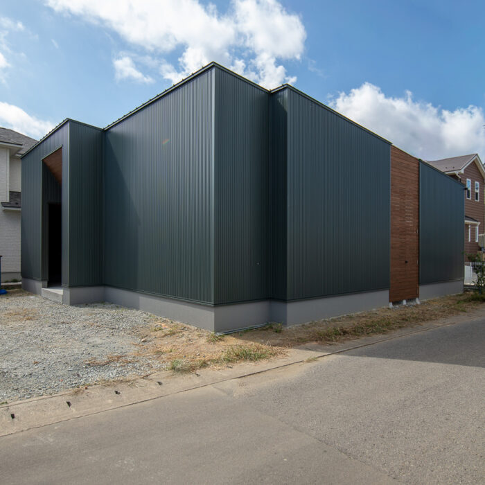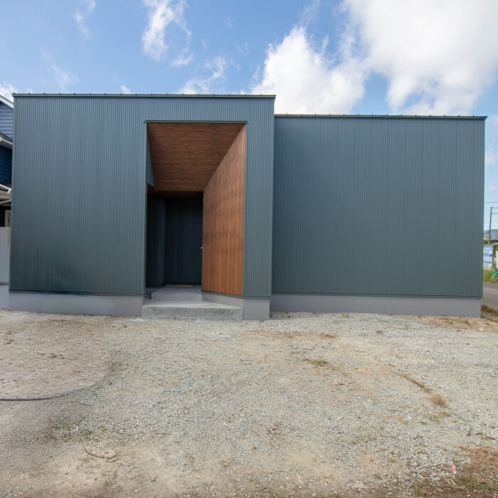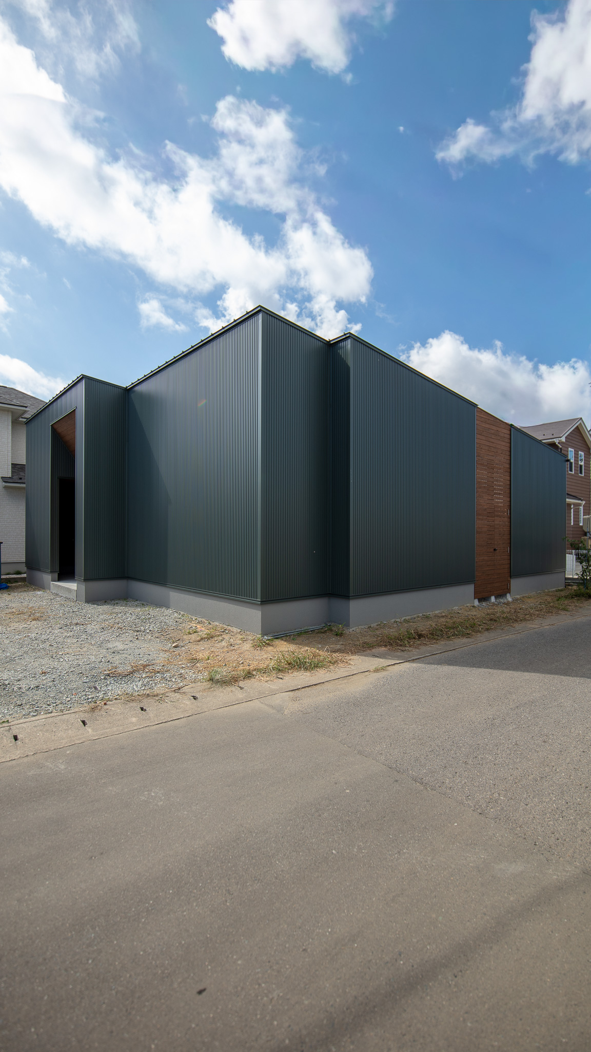 ガルバリウム鋼板のディープグリーンが、空に映えるシンプルな佇まい。木目のエントランスがやわらかなアクセントになって、無機質になりがちな外観にあたたかみを添えています。