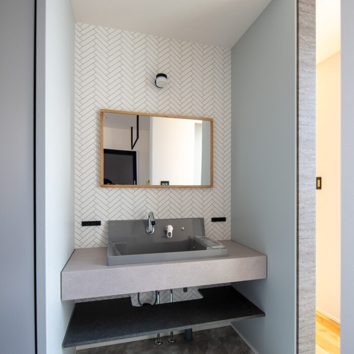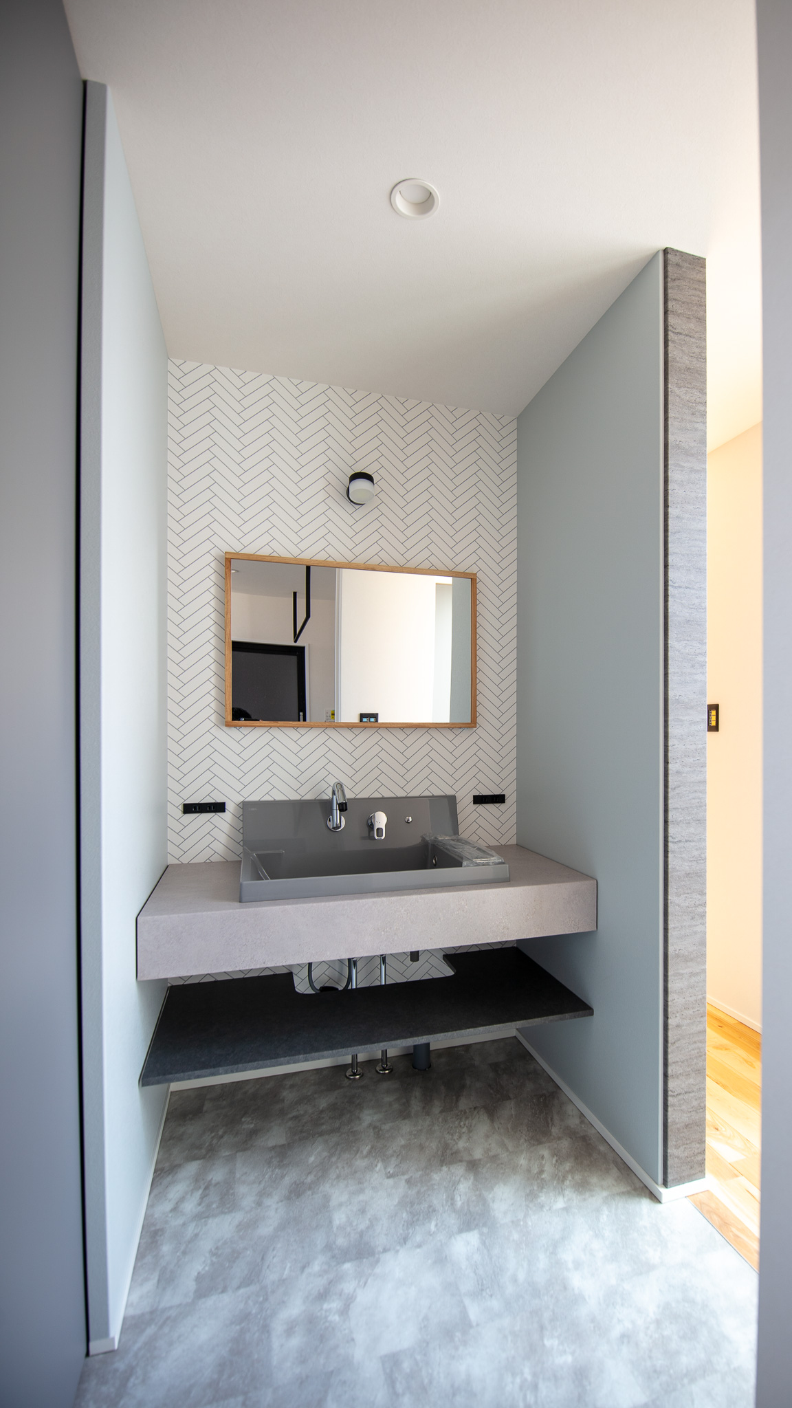 ヘリンボーン柄のタイルとモルタル調のカウンターが、ホテルのような上質さを感じさせる洗面スペース。