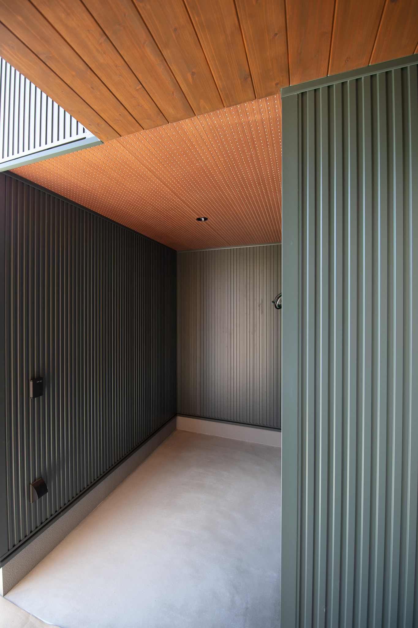 木の天井とグリーンの外壁が印象的な玄関ポーチは、まるでホテルのアプローチのよう。