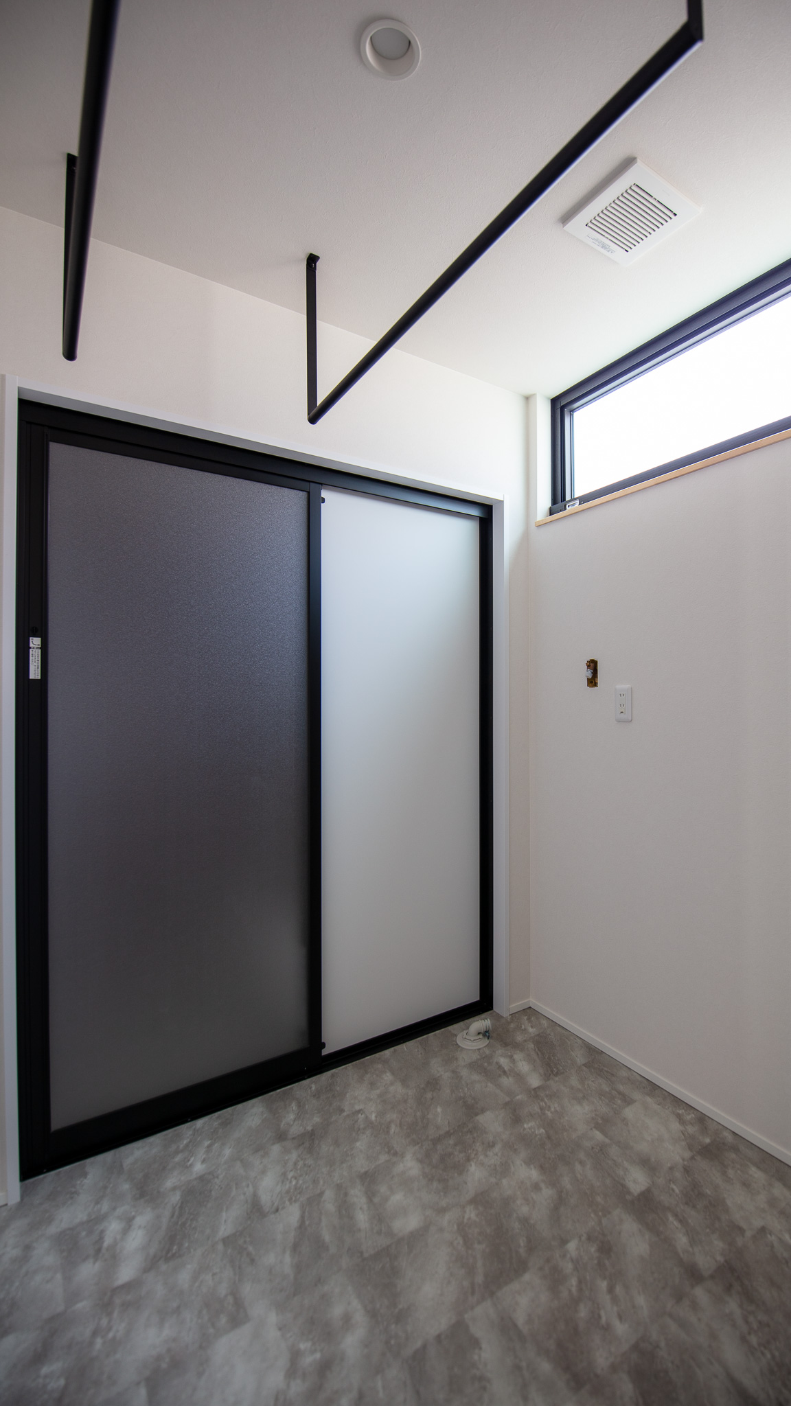 天井のアイアンバーで室内干しもすっきり決まる、脱衣ランドリースペース。