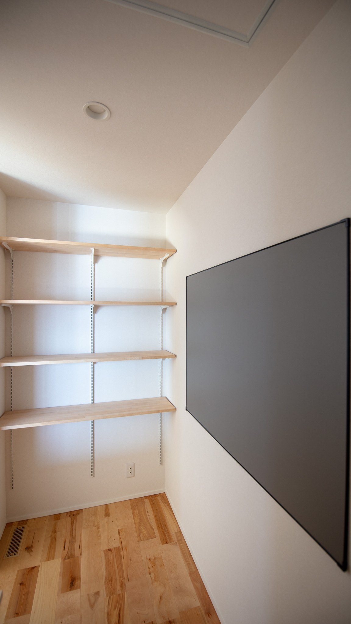 壁いっぱいの可動棚と黒板スペースがある部屋は、子育て世帯にうれしい柔軟さ。