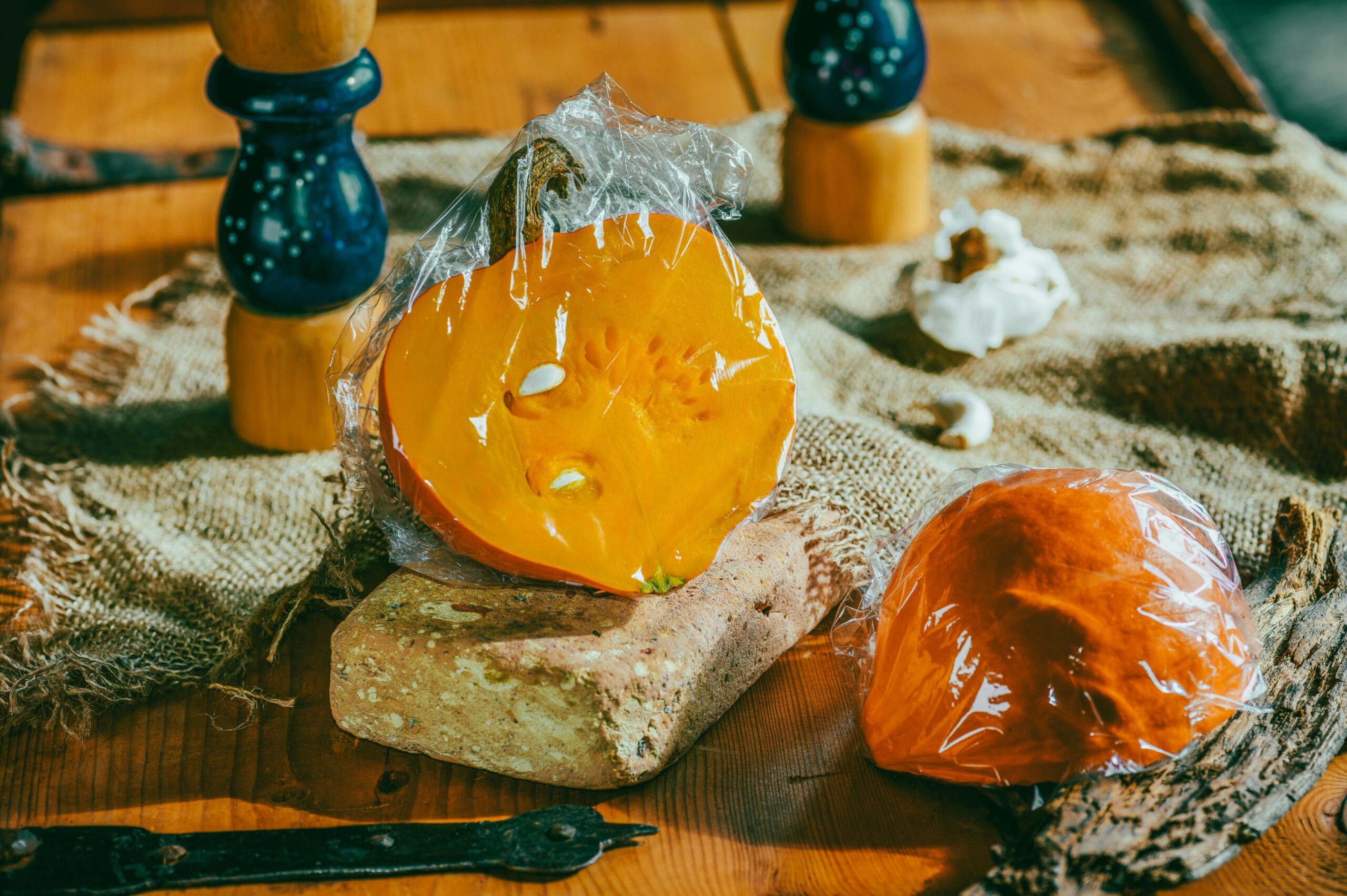 ①かぼちゃを電子レンジで加熱し、粗熱を取ったら皮の部分を取り除く。